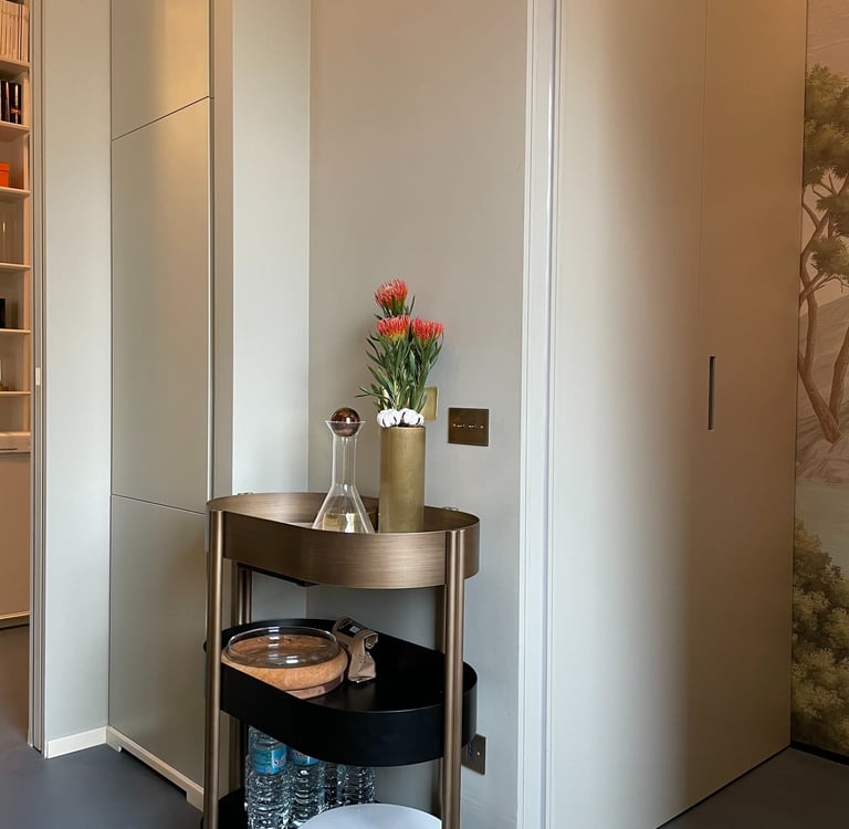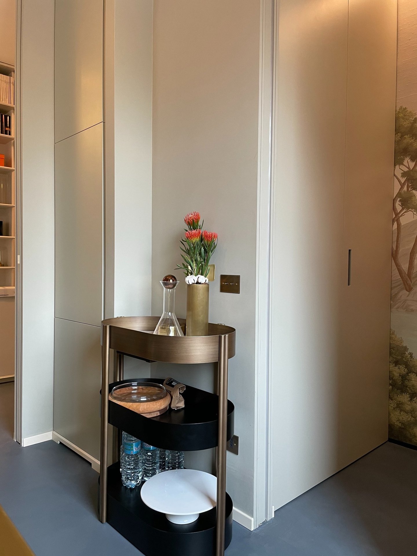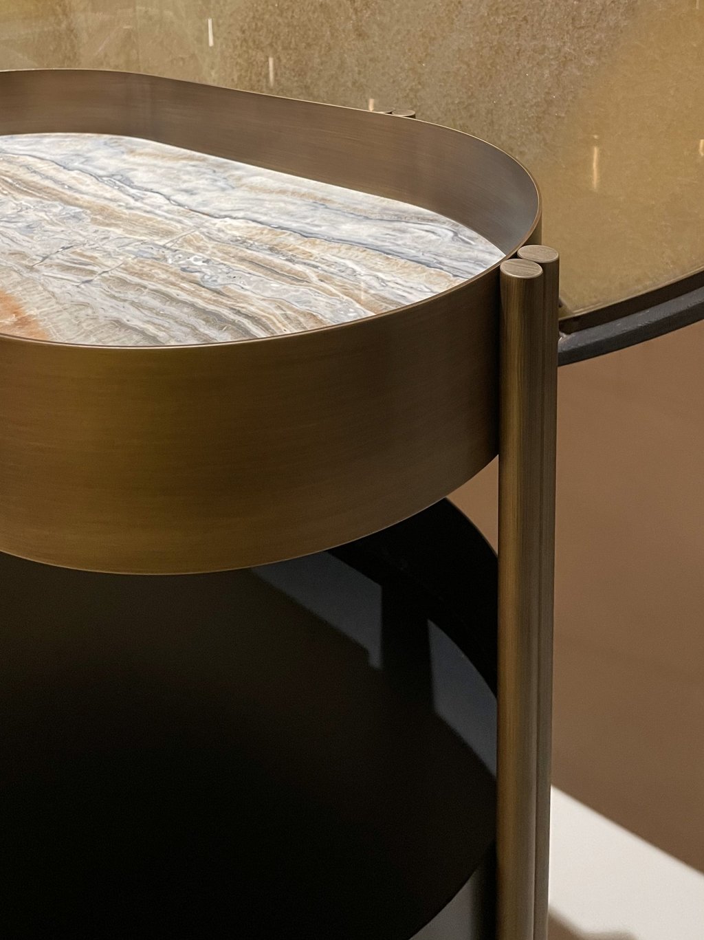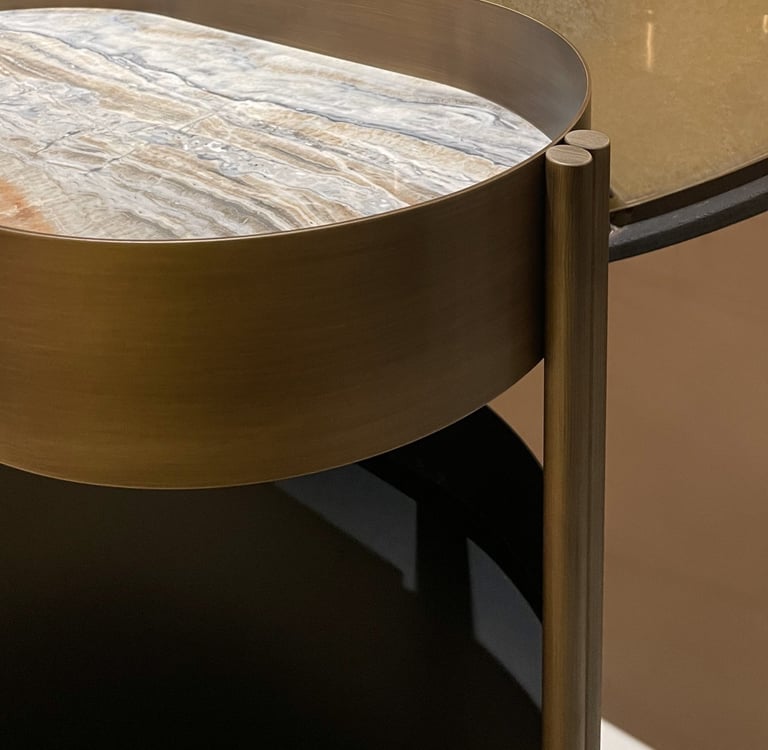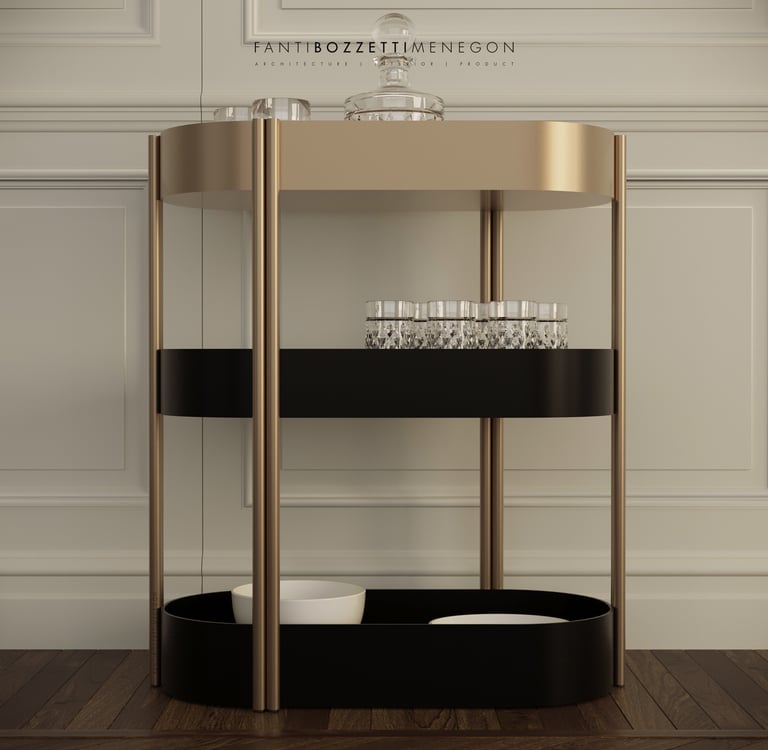 Liquor trolley in brass and black metal with practical invisible ball wheels and marble shelf.