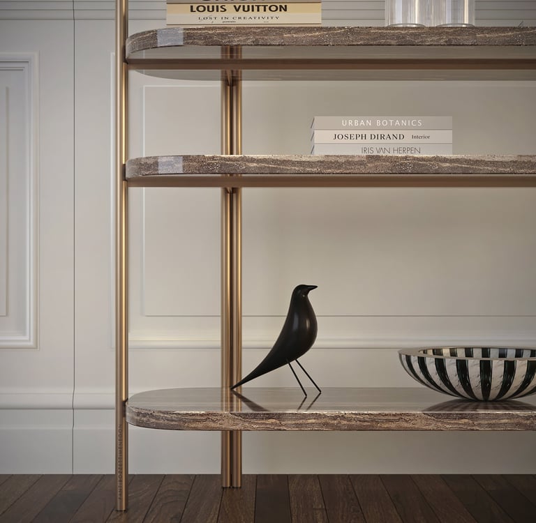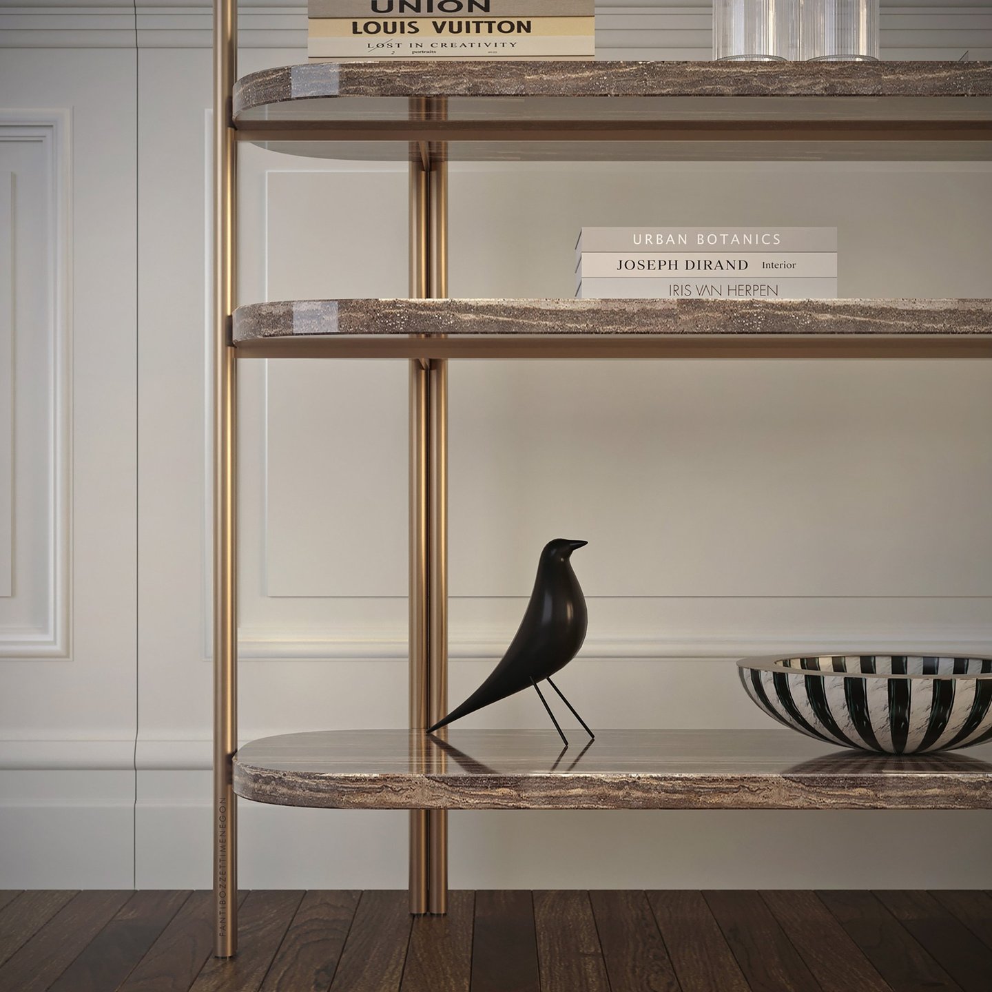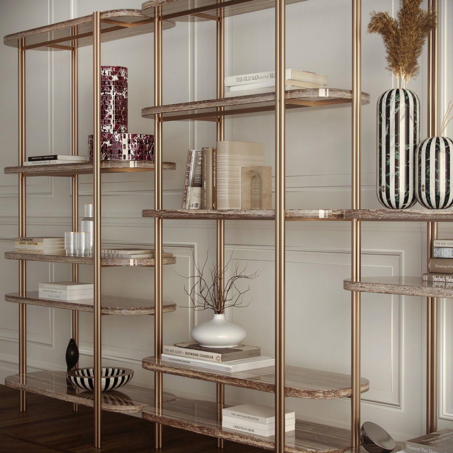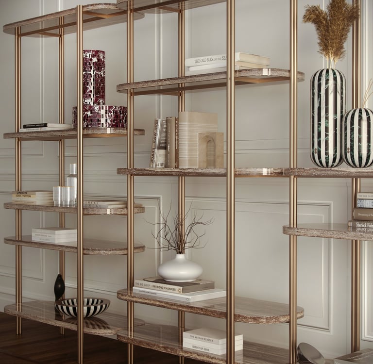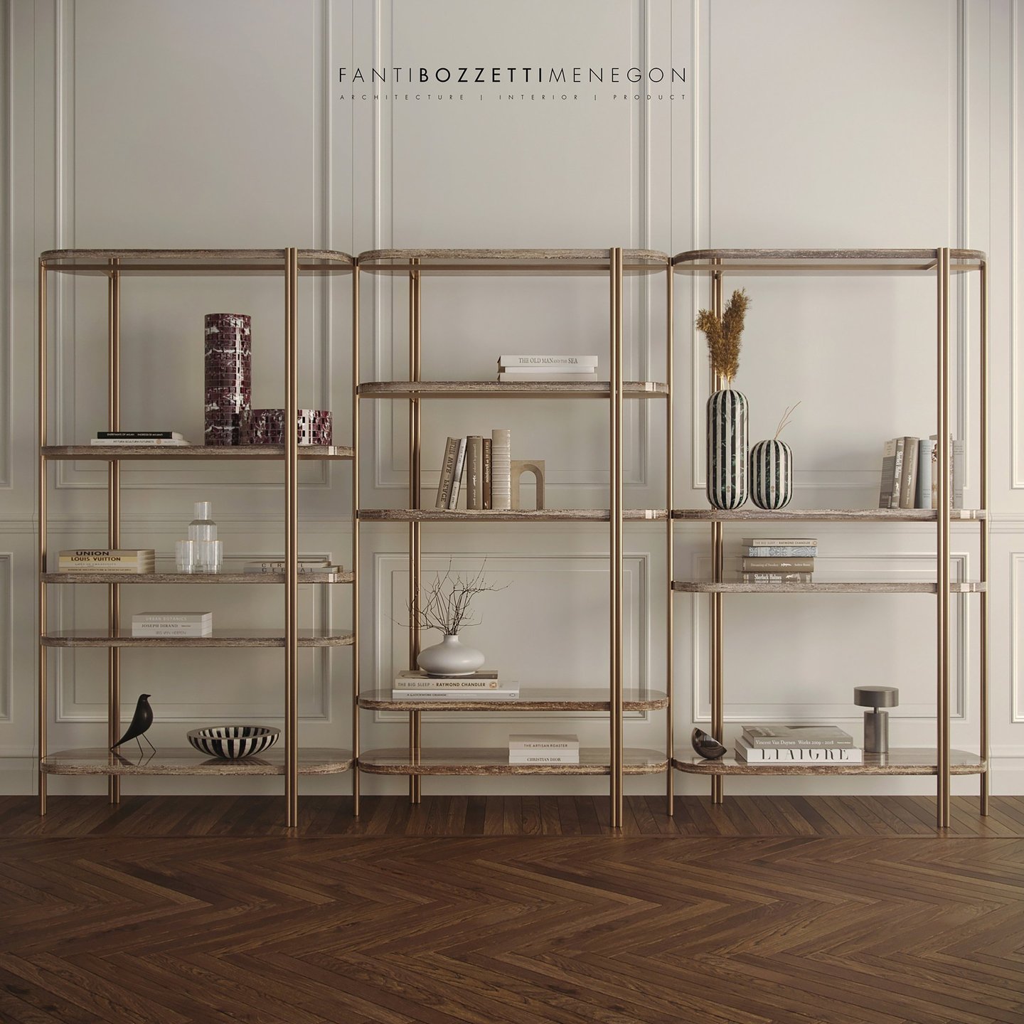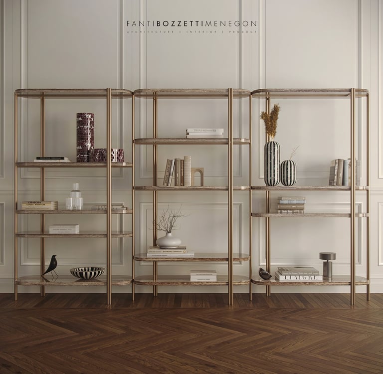 Free-standing double-sided bookcase composed of three different modules that can be freely combined for infinite compositions. Metal structure with natural brass finish and marble, wood or lacquered shelves. From