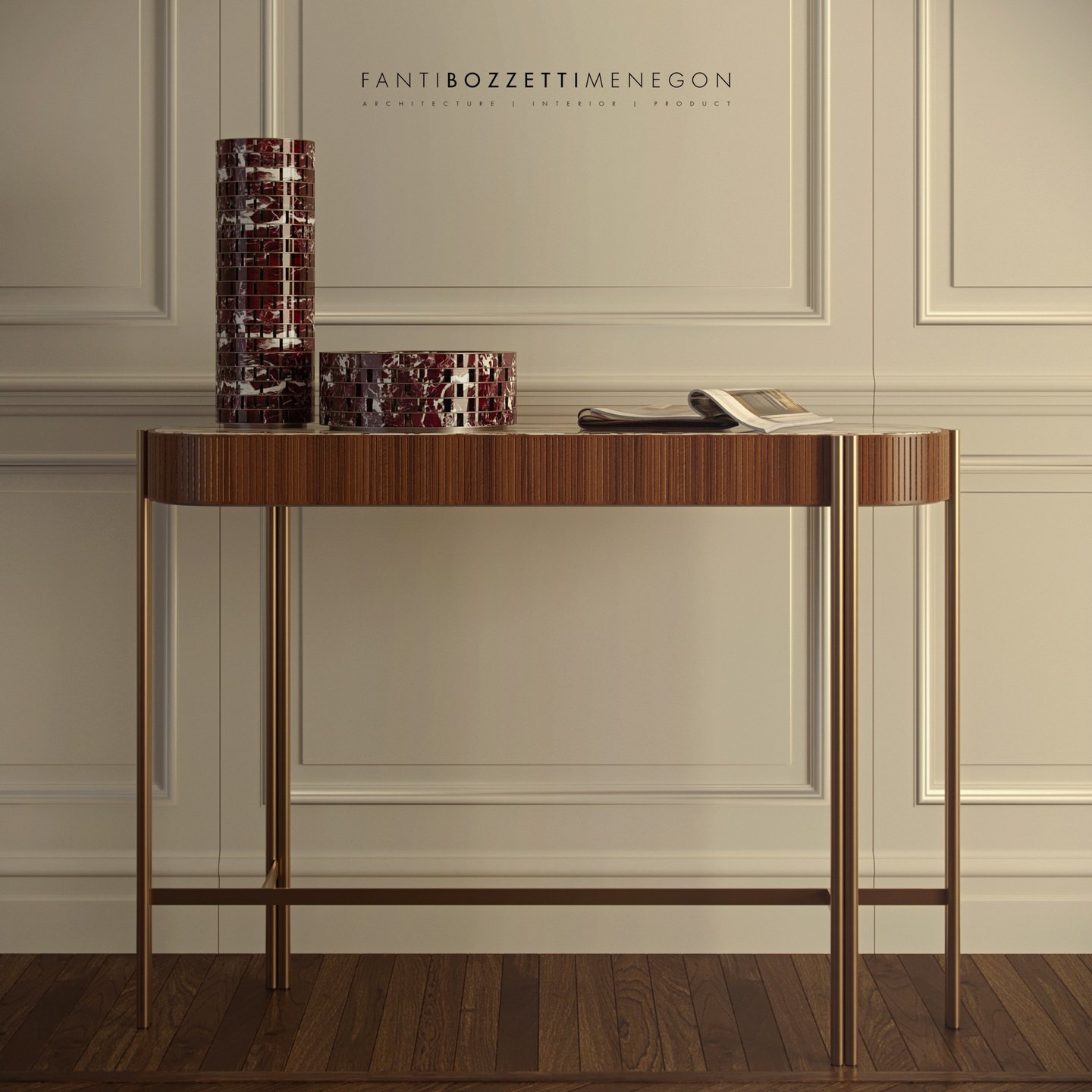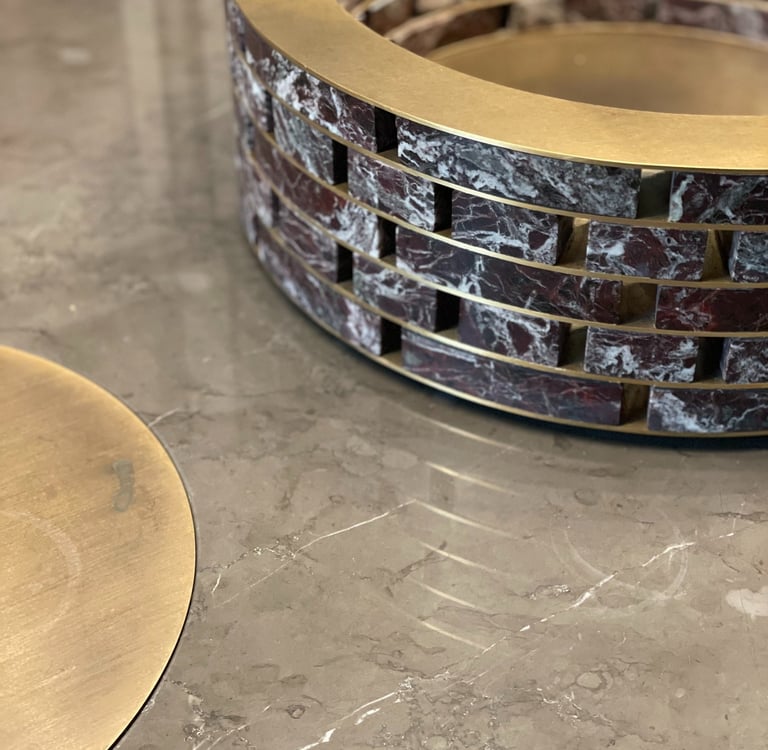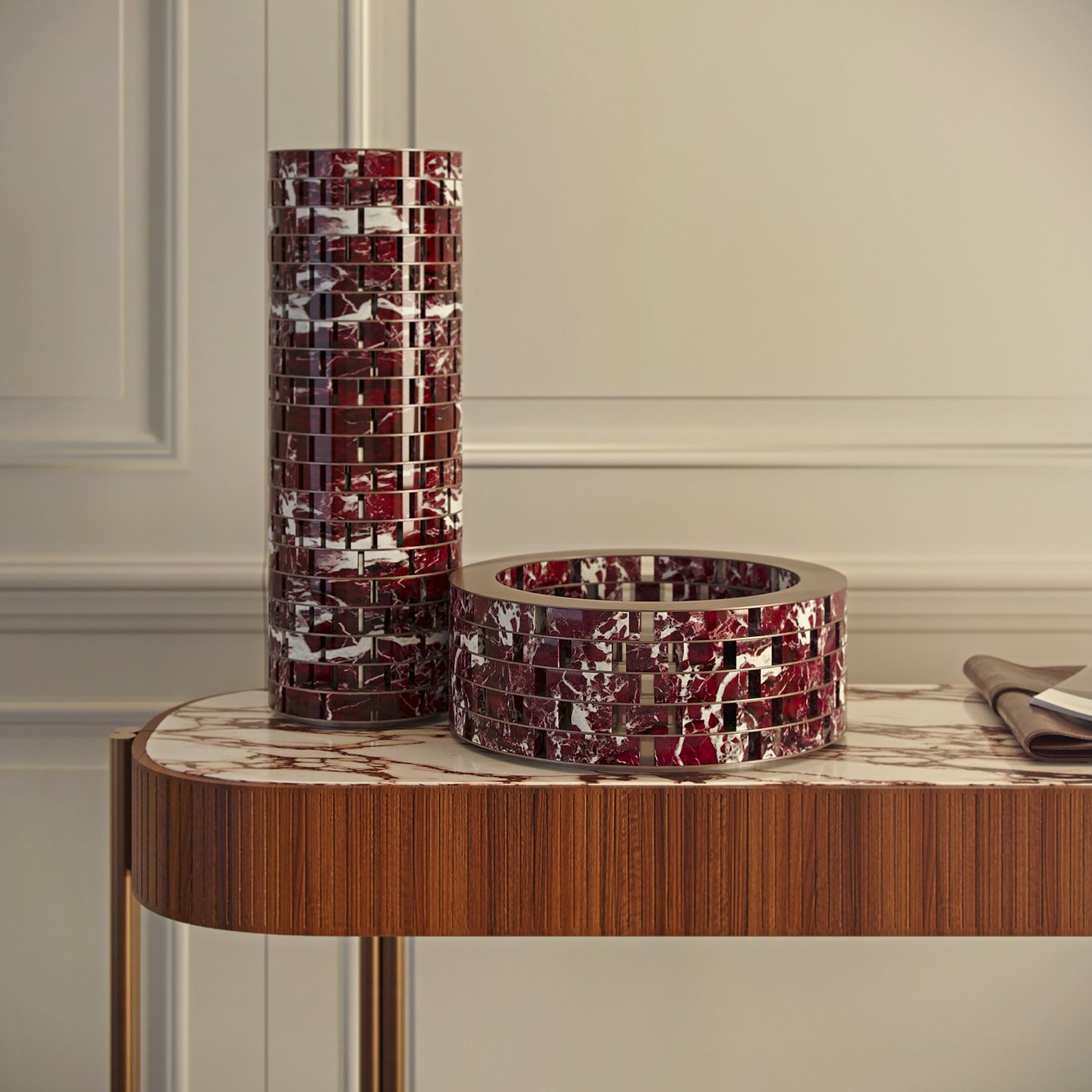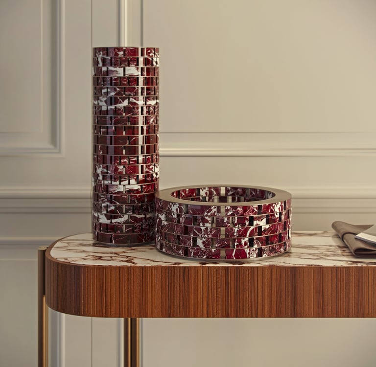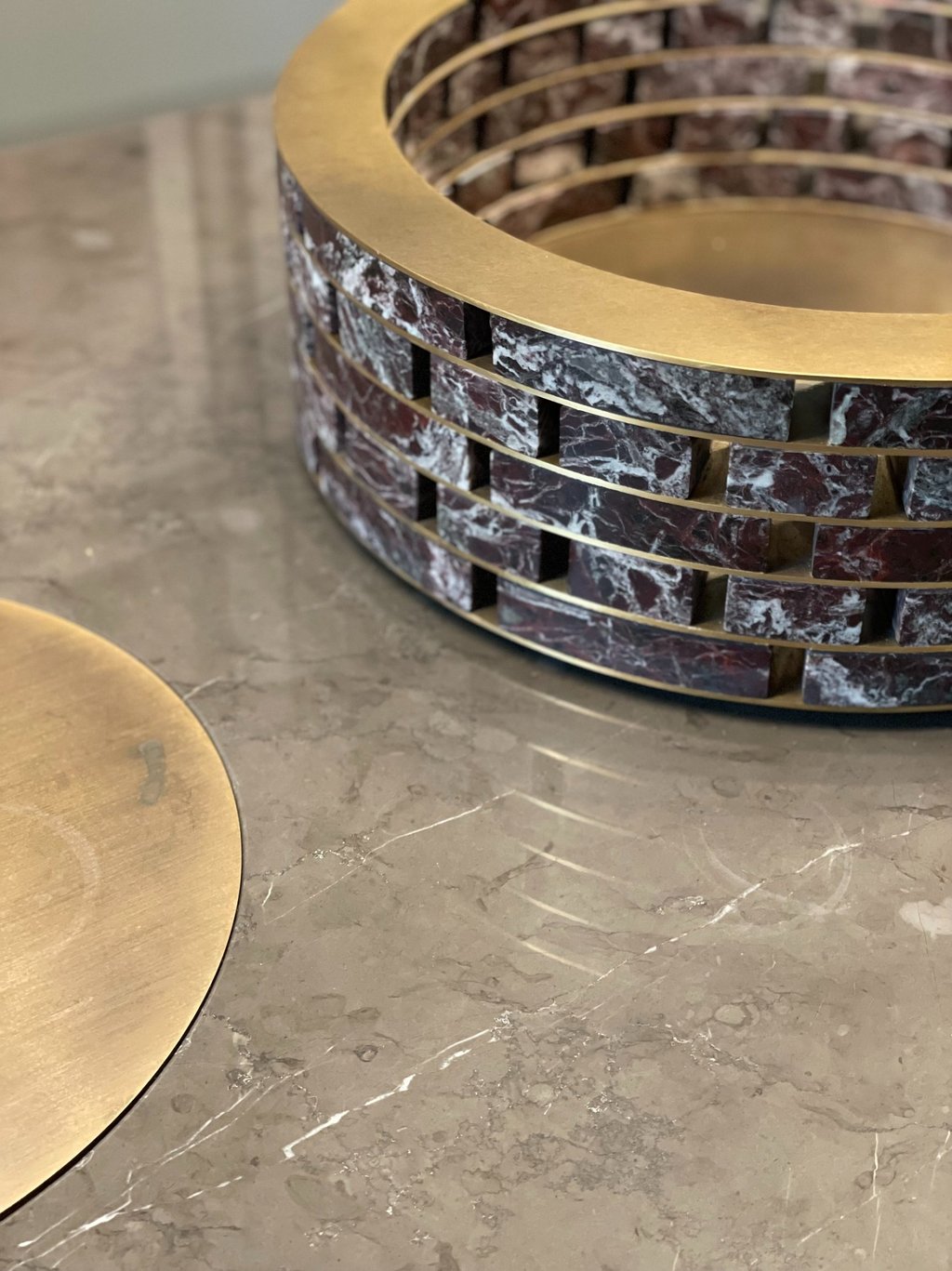 Series of vases composed of natural brass discs and pieces of red Levanto marble.