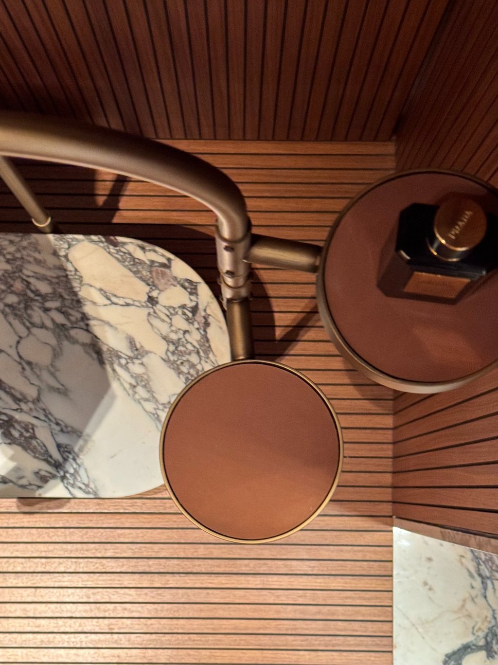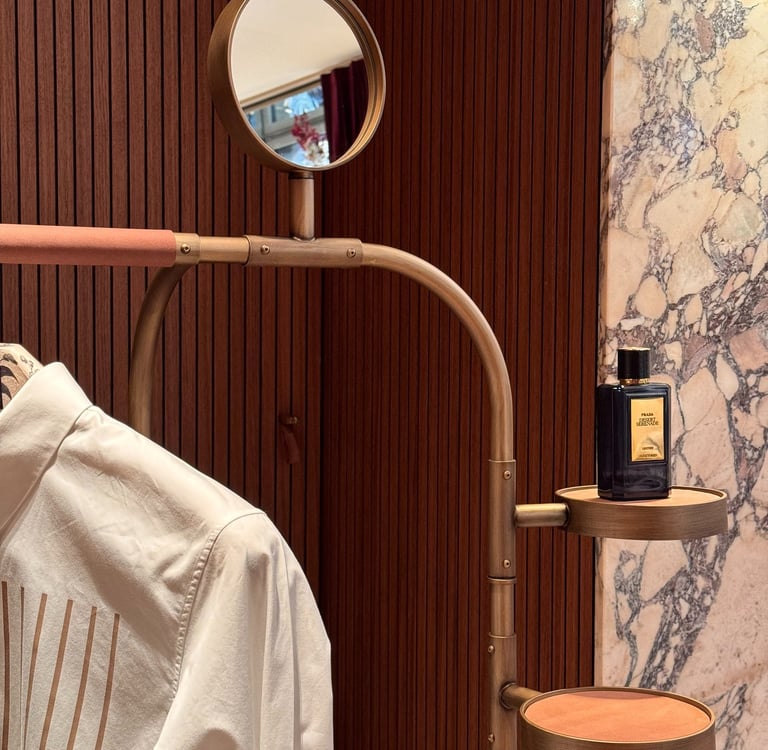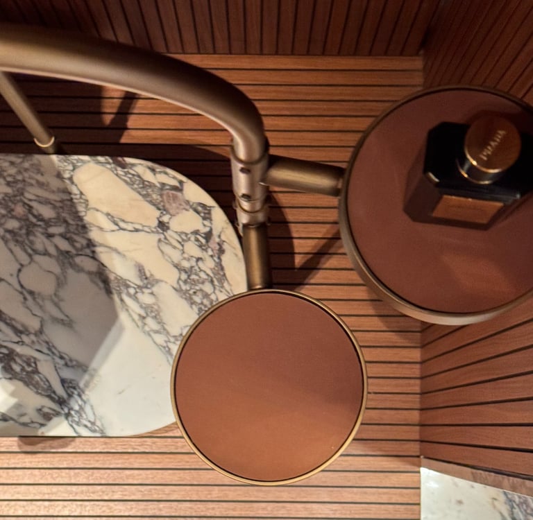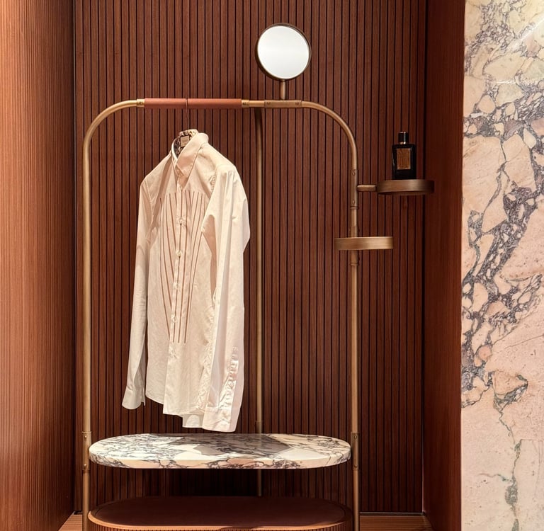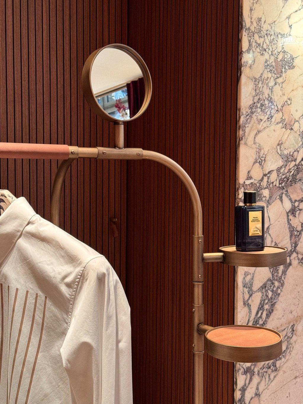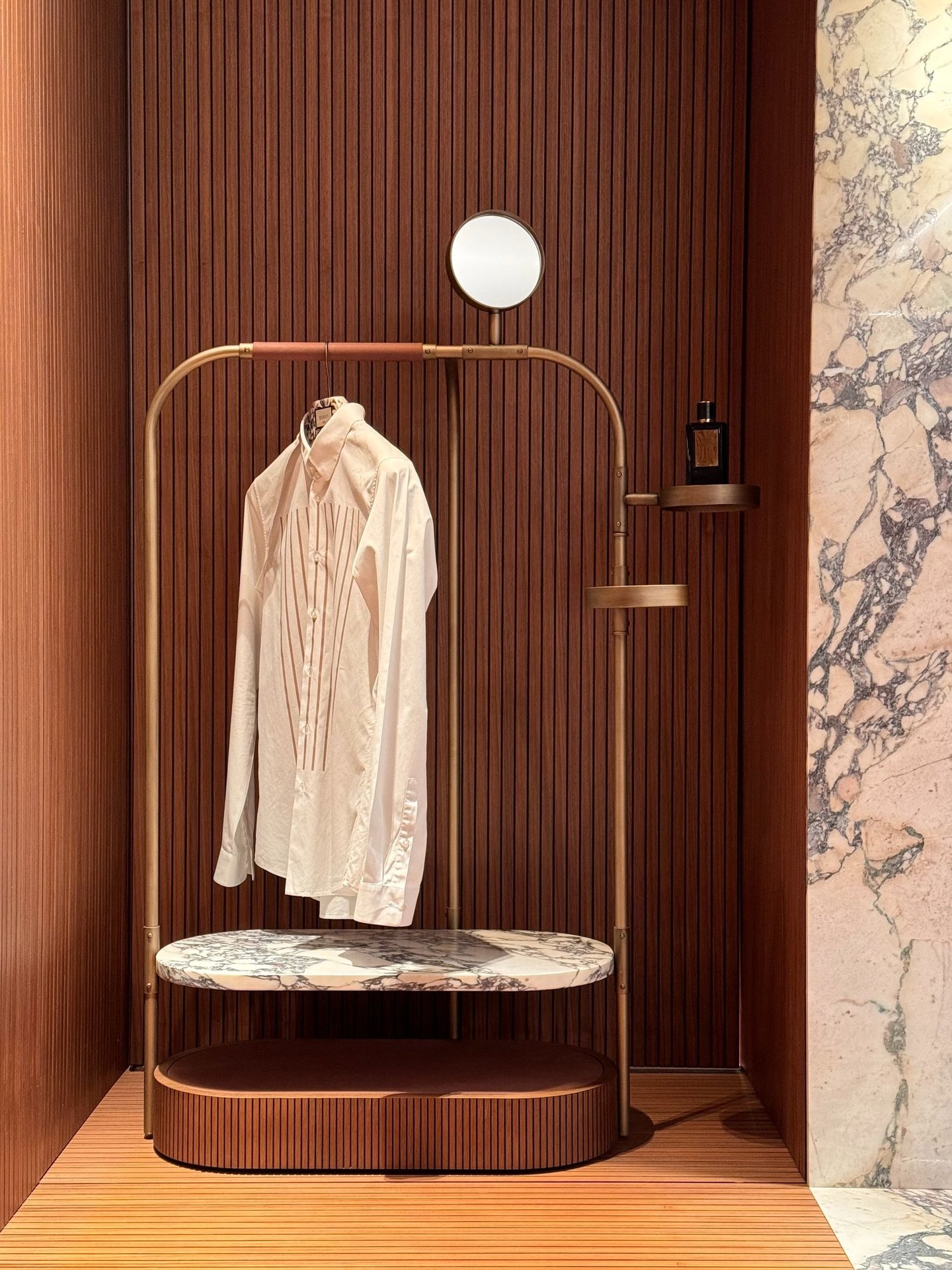 The reinterpretation of a classic valet stand. A wooden base hides ball wheels inside for a more practical handling and an invisible drawer. The accessories that can be attached to the structure vary from small leather trays to the magnifying mirror. From €10.760,40 vat included
