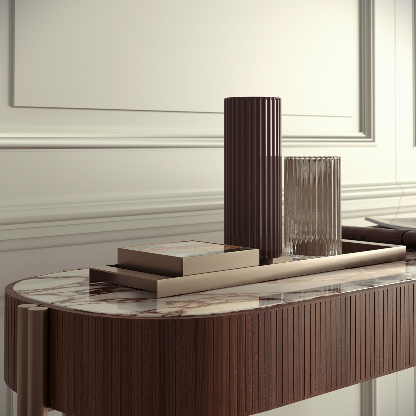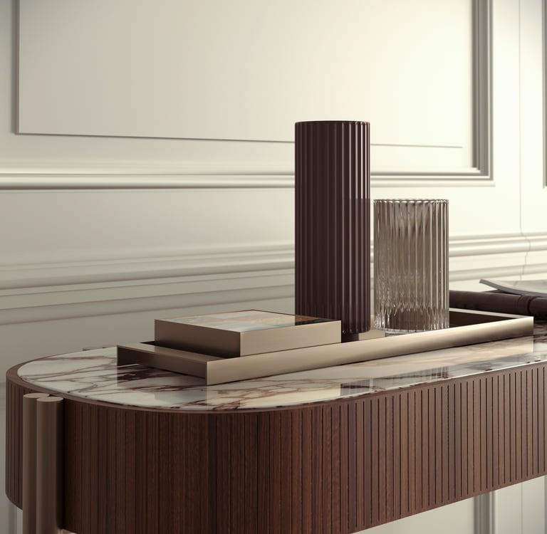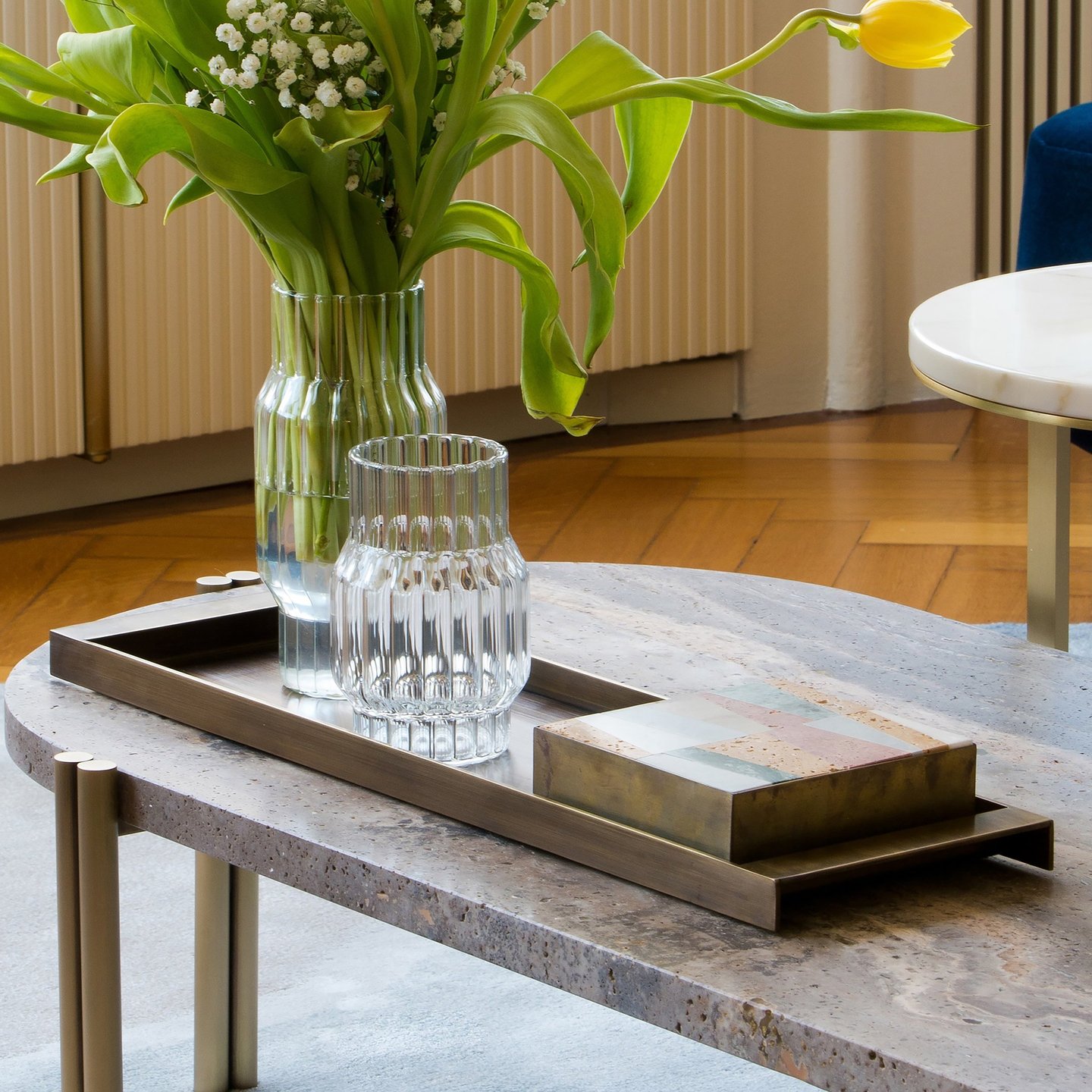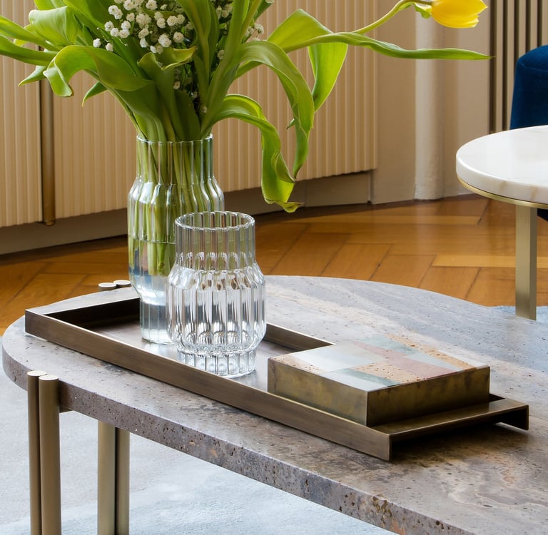 Natural brass tray with special accessory cube in marble mosaic