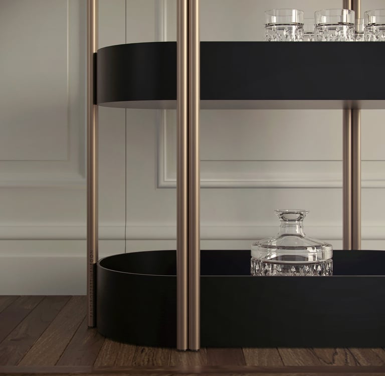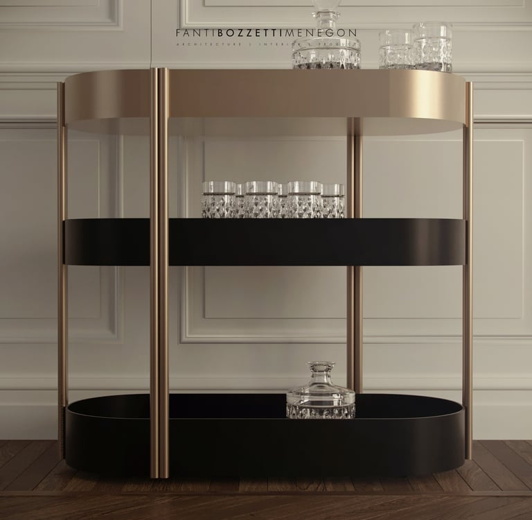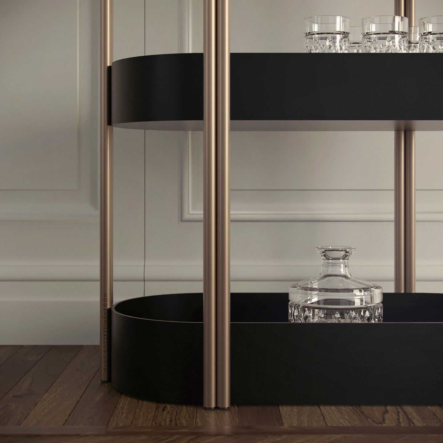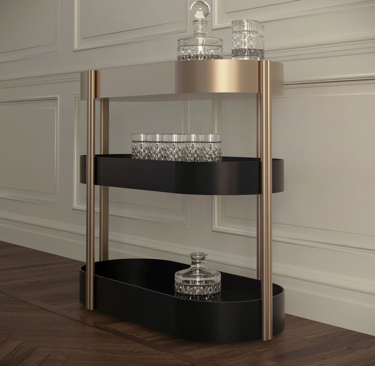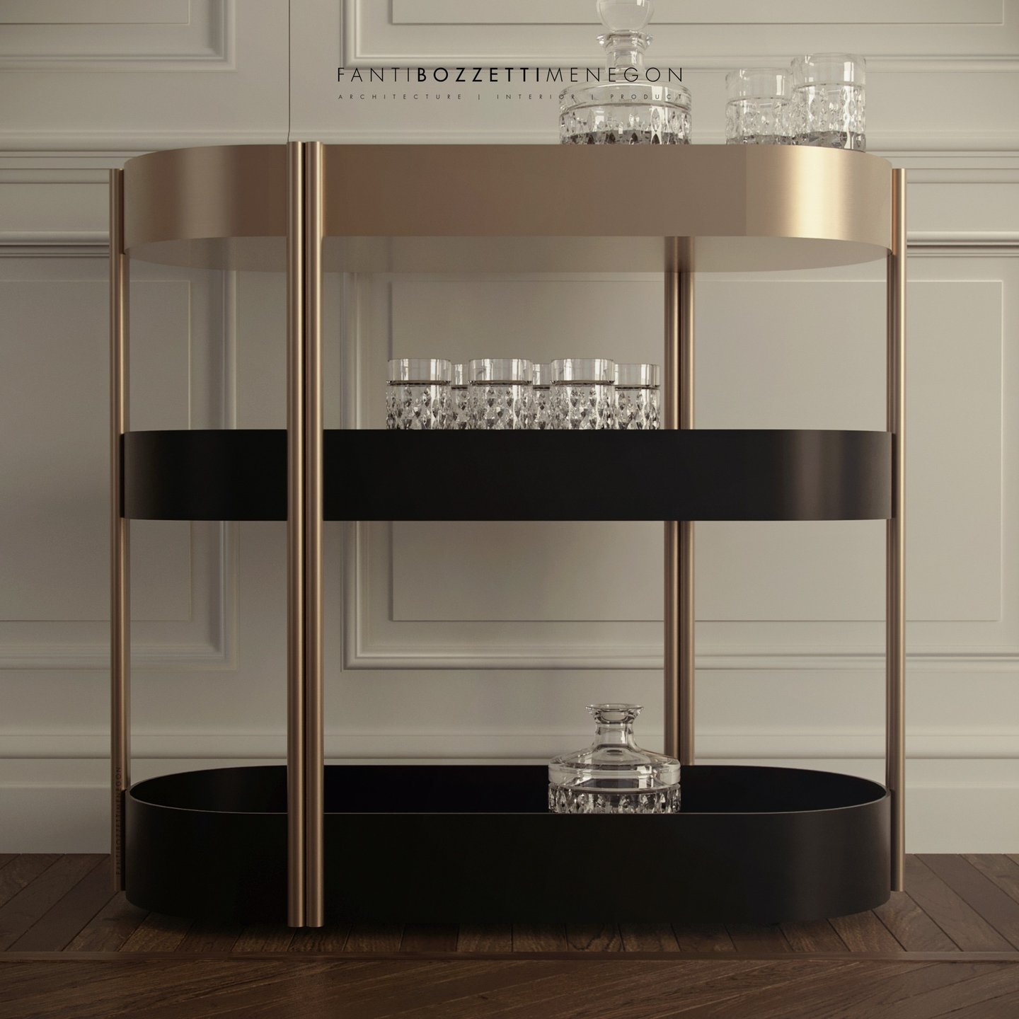 Born for fine dining restaurants, this liquor trolley in brass and black metal has practical hidden ball wheels and a marble shelf. From €4.263,17
