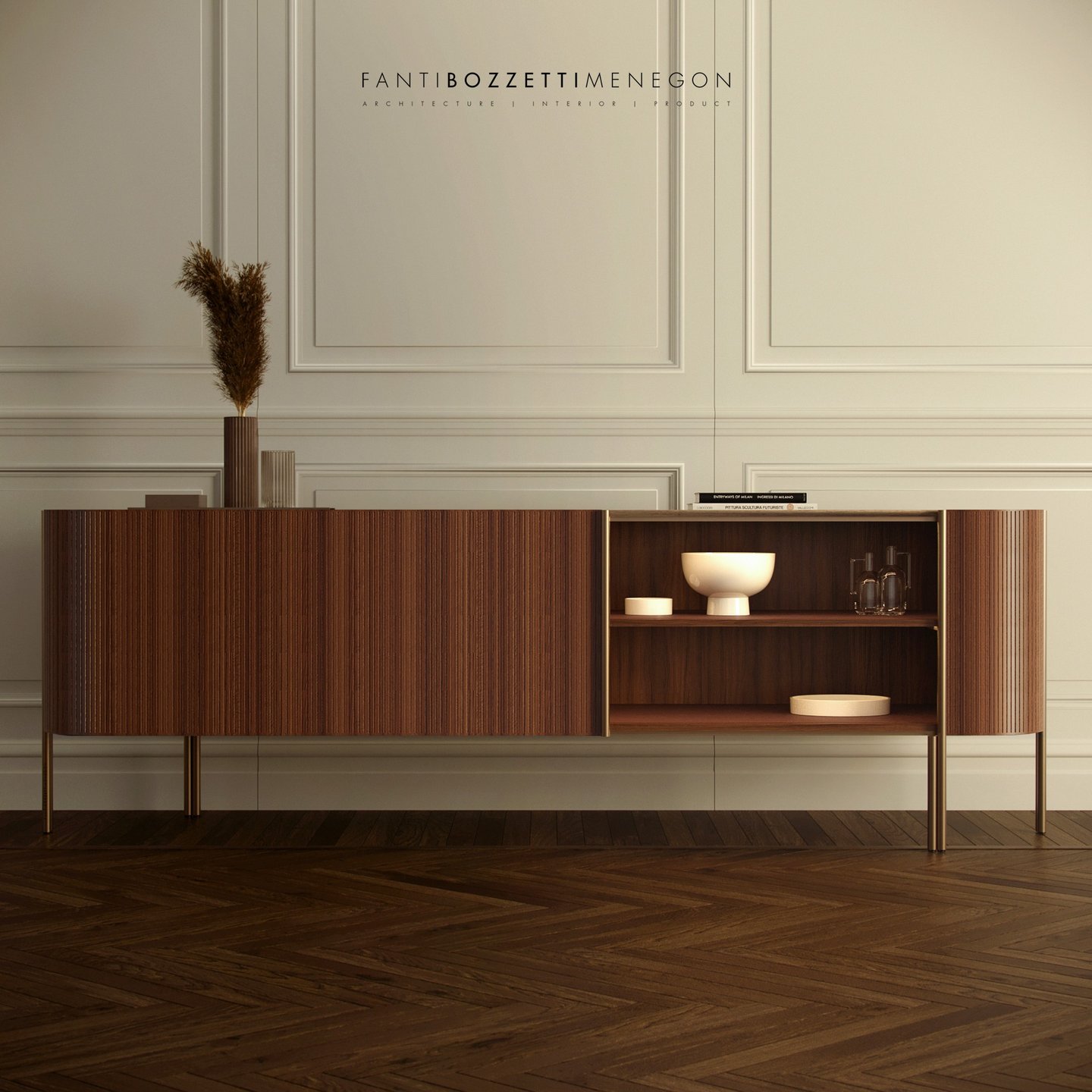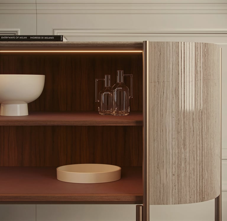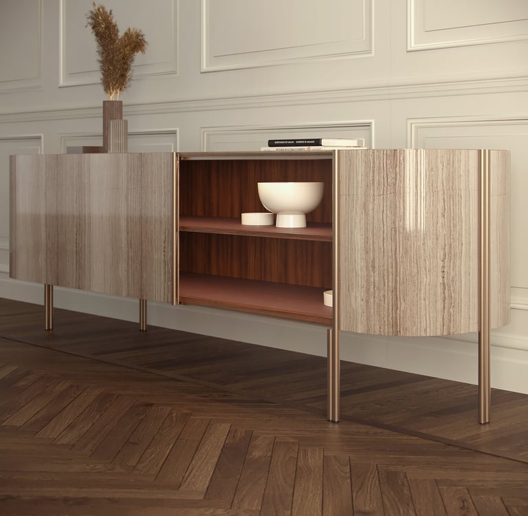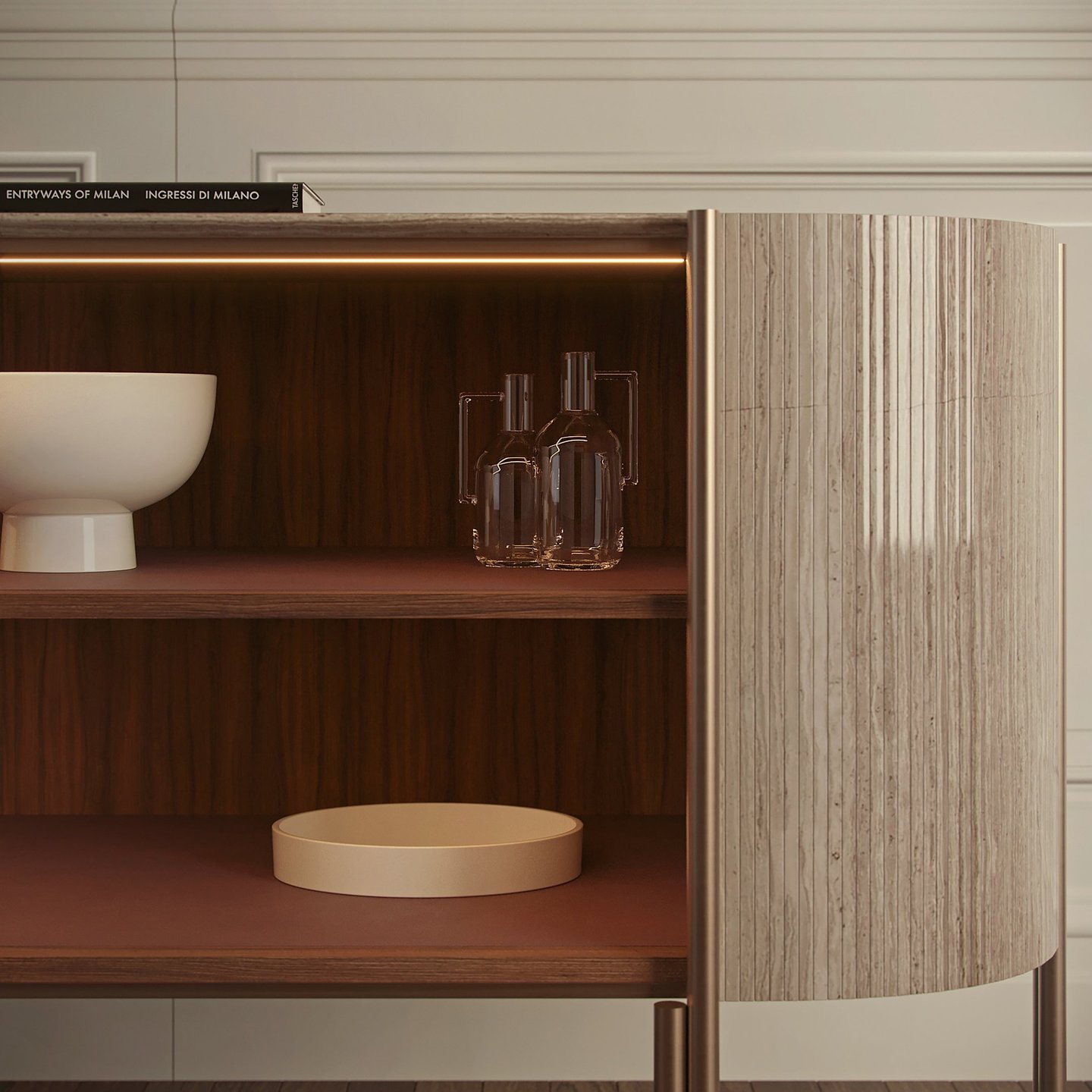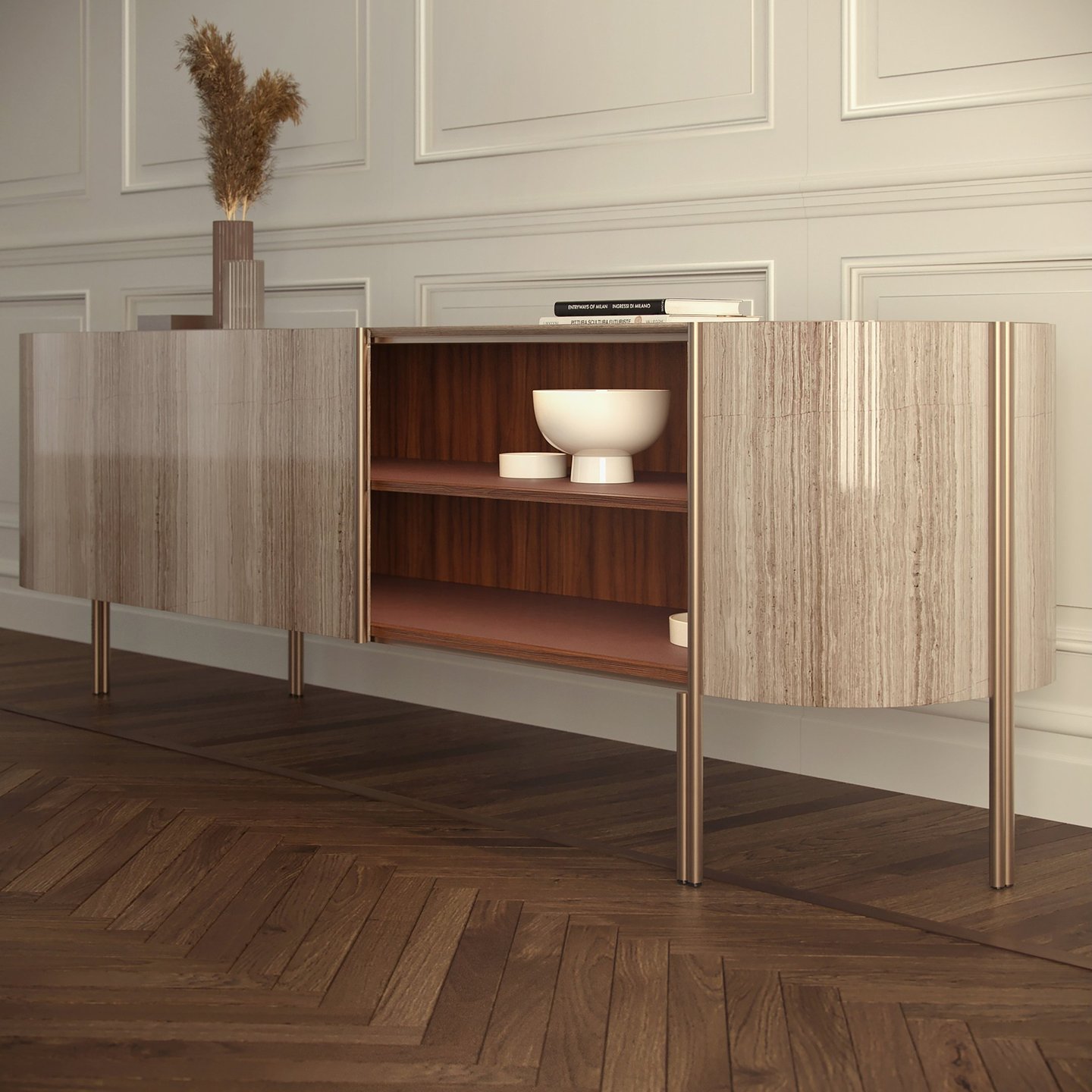 The ERA sideboard shape underlines the high quality of the craftsmanship. The doors, a trademark, are made of thin slats of marble that slide fluidly along the precisely cut track, recalling the feel of a roll-top desk but without the drawbacks of delicate vintage. Once opened the interiors are made of refined walnut Canaletto wood and bordeaux leather. The particular sliding doors allow to leave the sideboards half-open turning it into an open display. Available in eight different marble variants. From €21.764,13 vat included