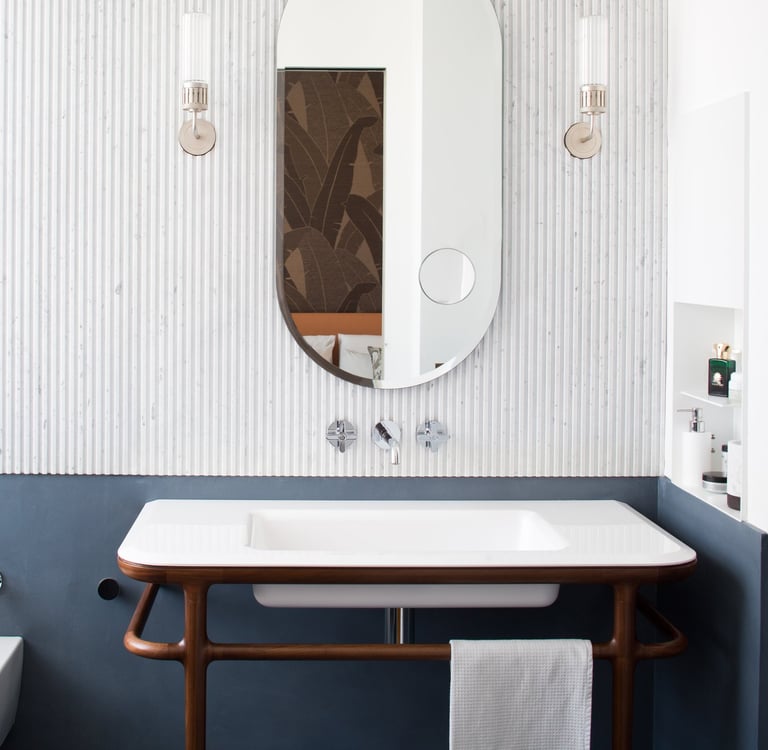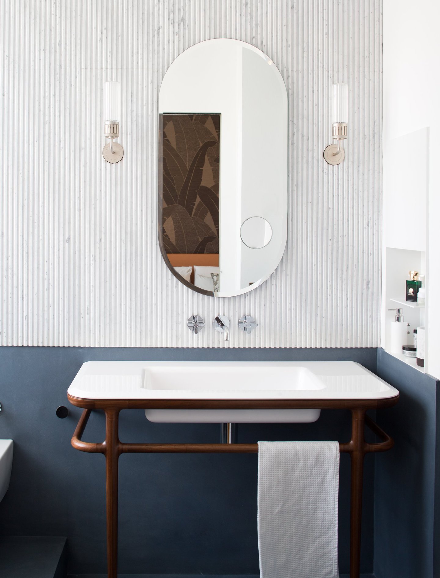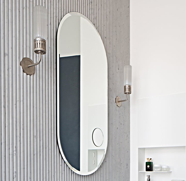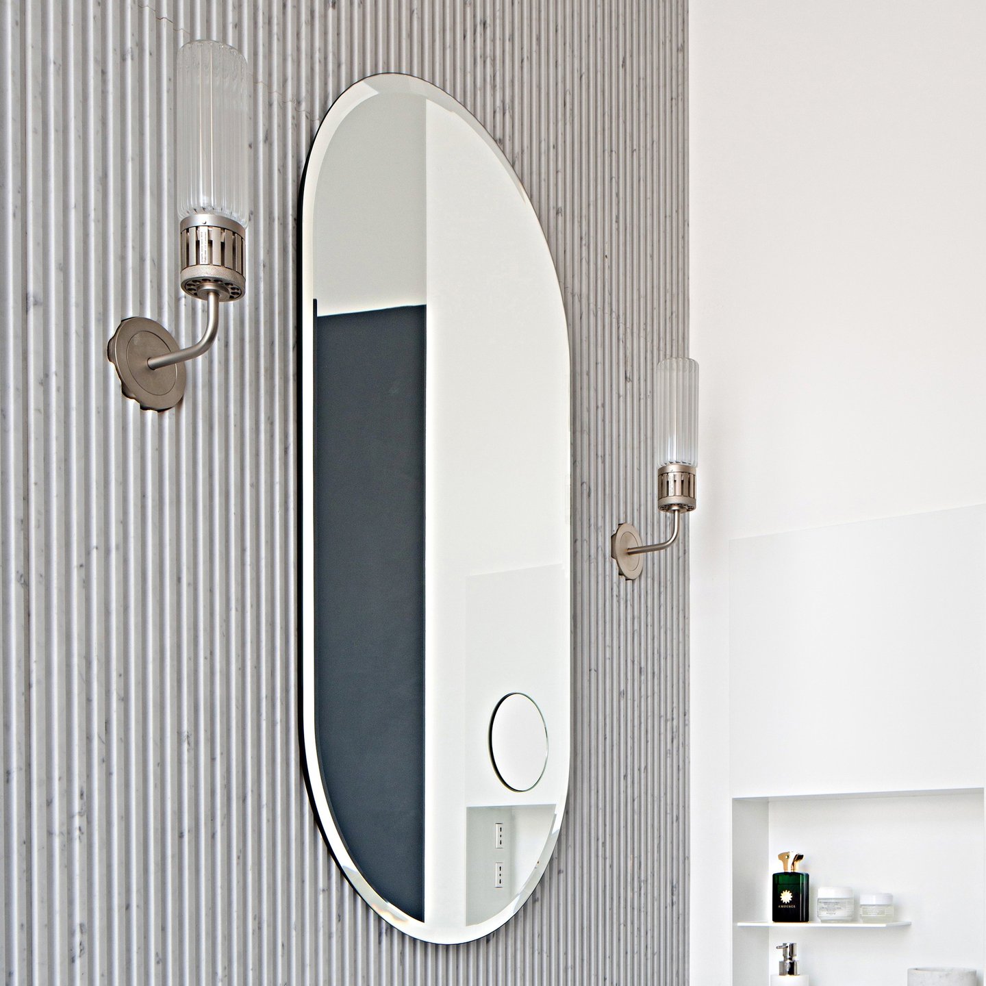 Biscuit-shaped mirror, bevelled with integrated feeder