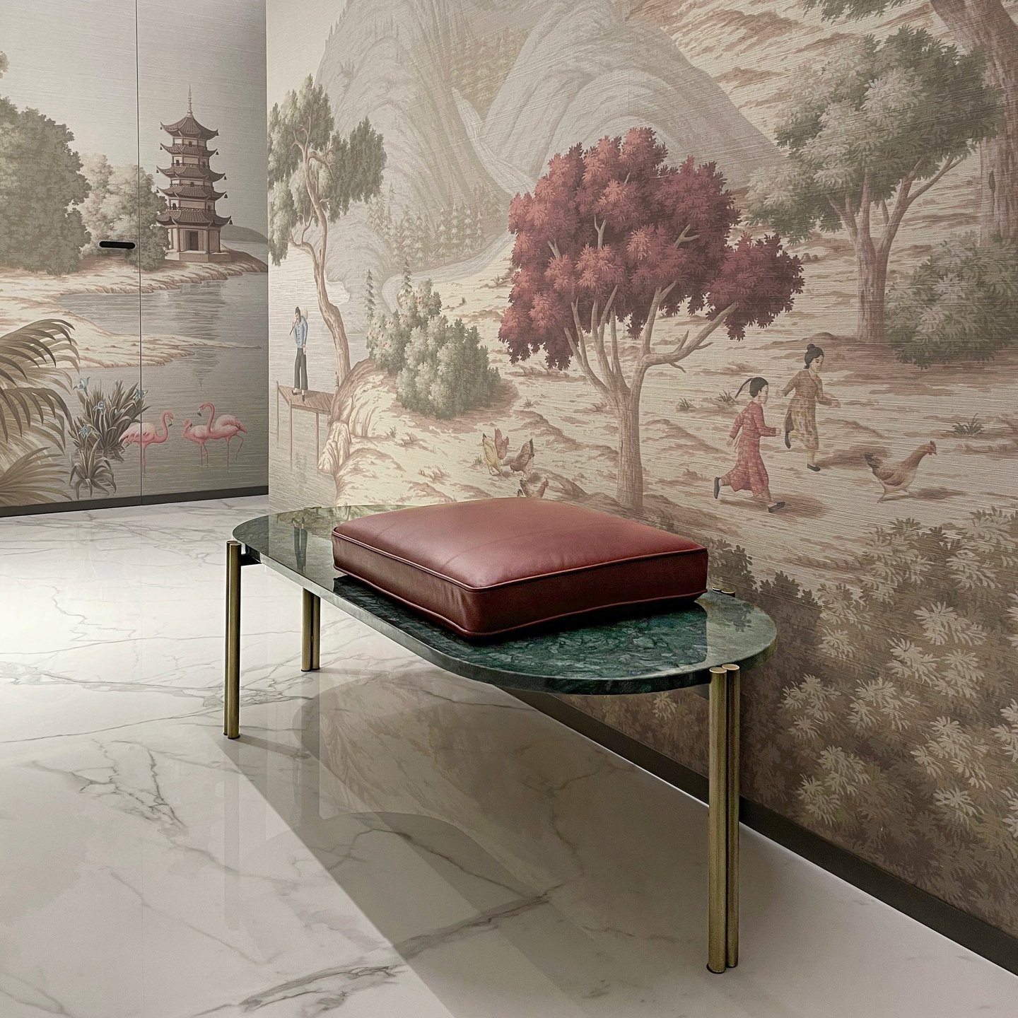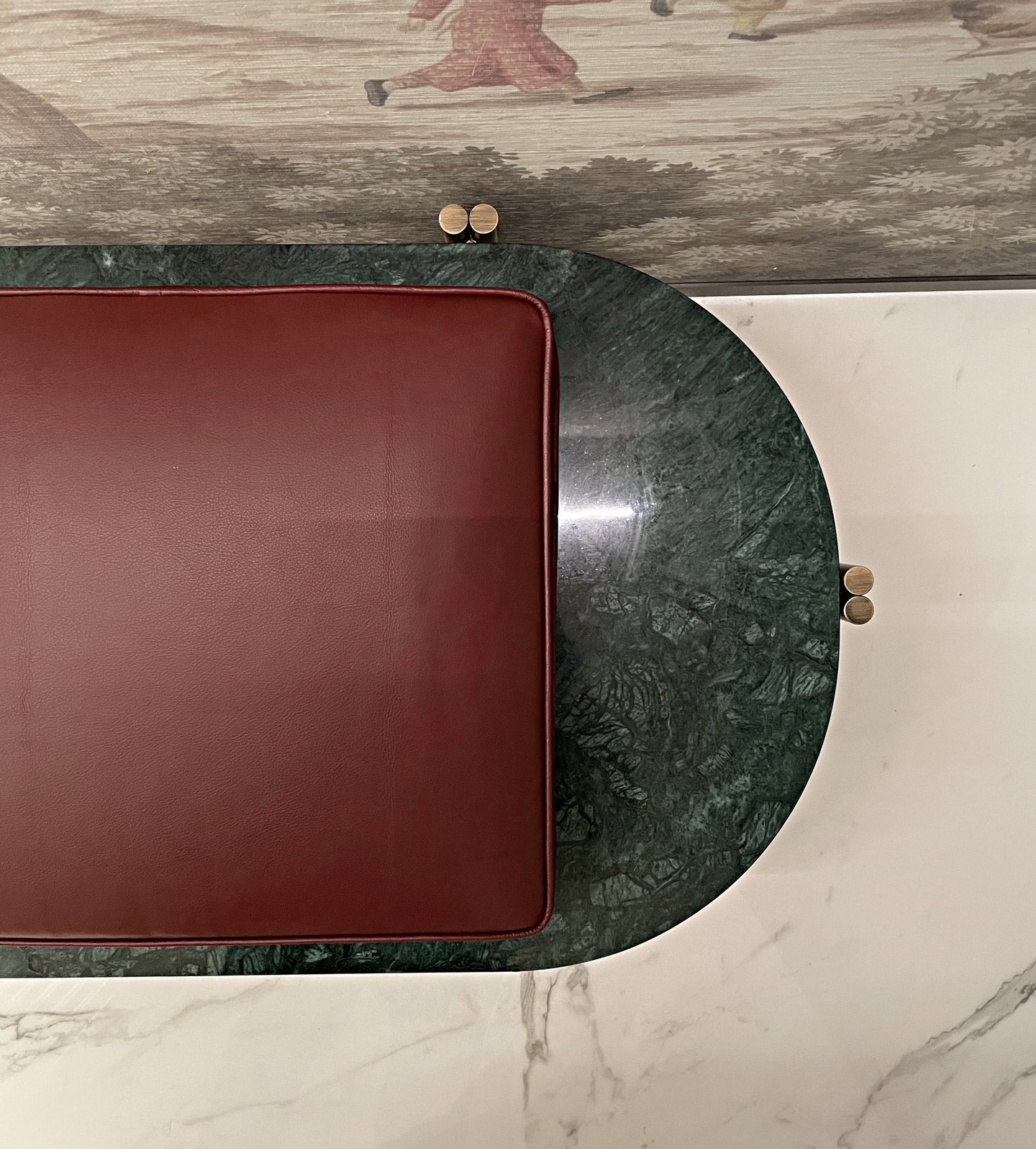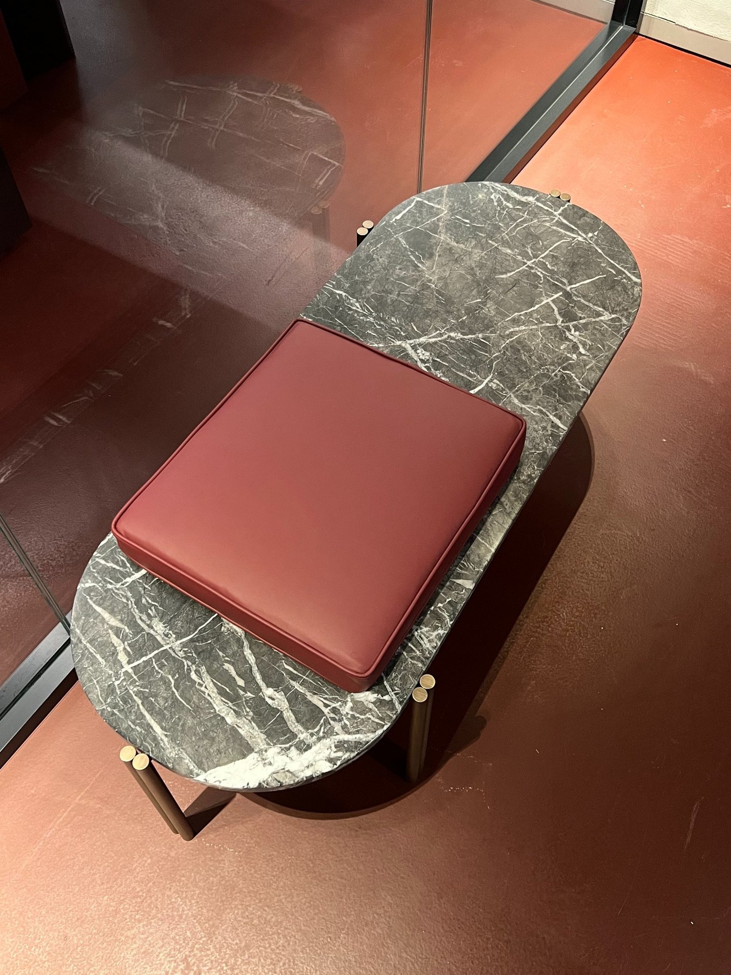 Marble bench with solid brass structure. The particular asymmetric structure of the legs emphasi- zes the feeling of lightness of the product, allowing the thickness of the marble to be appreciated a soft cushion in specially sized natural leather acts as a seat. From €3.663,66 vat included