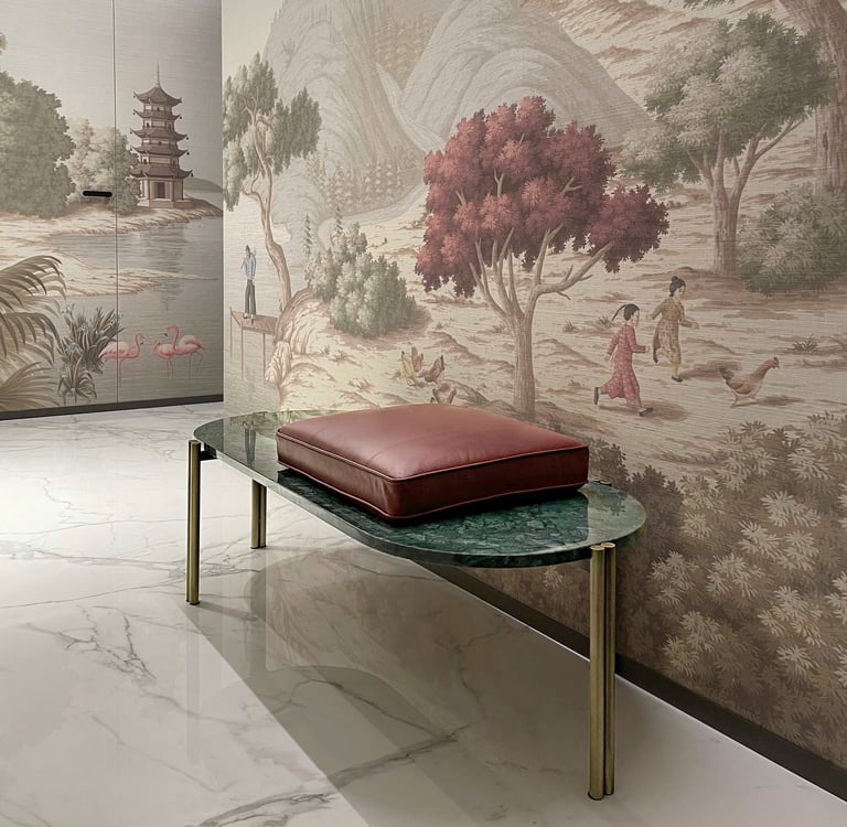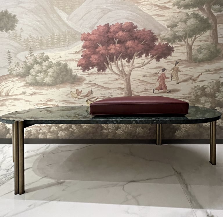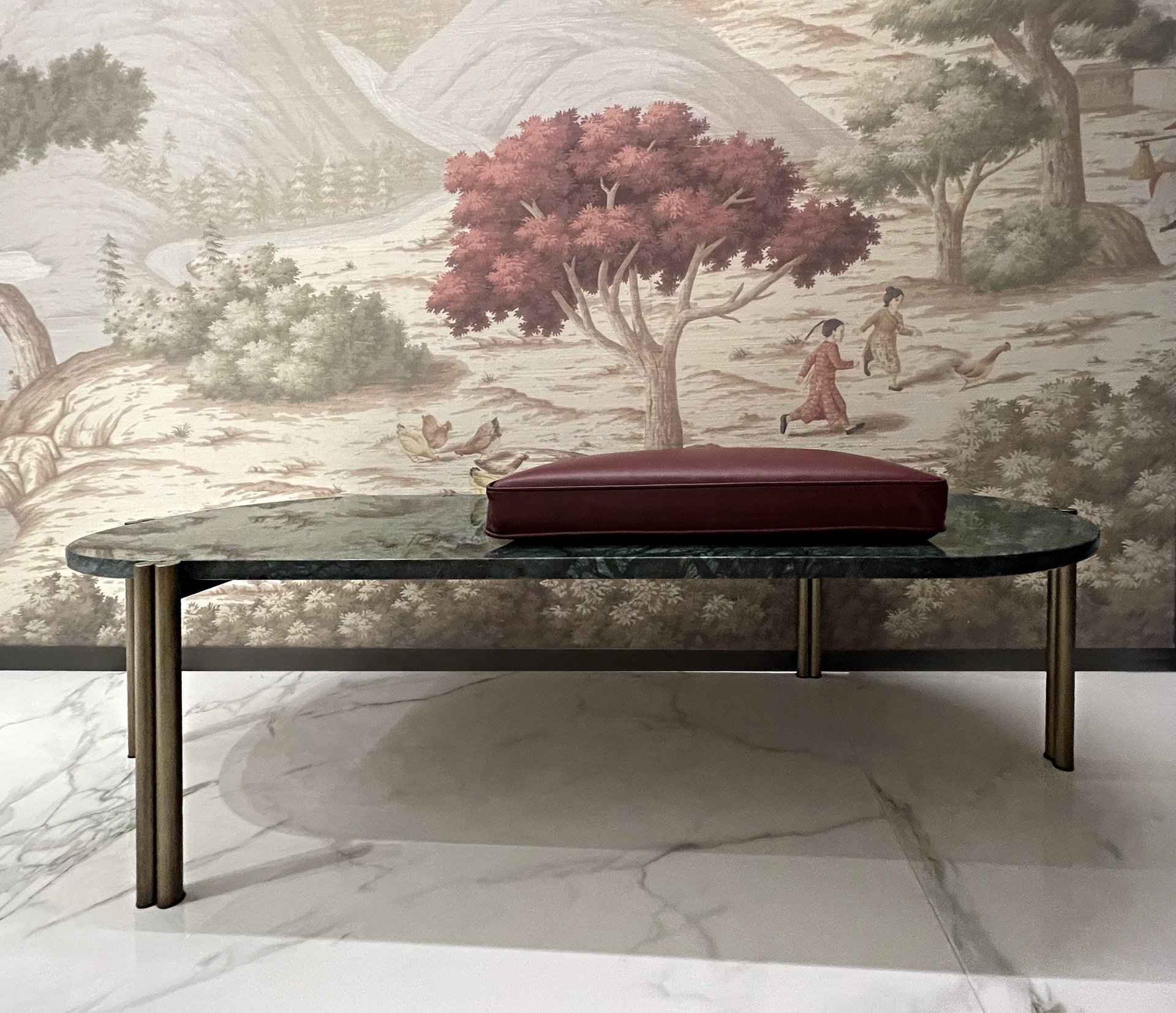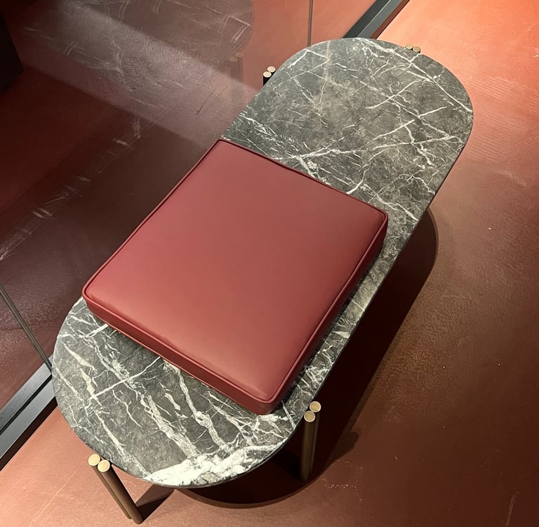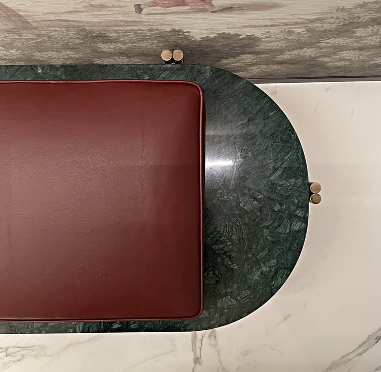 Marble bench with solid brass structure. The particular asymmetric structure of the legs emphasi- zes the feeling of lightness of the product, allowing the thickness of the marble to be appreciated a soft cushion in specially sized natural leather acts as a seat. From €3.663,66 vat included