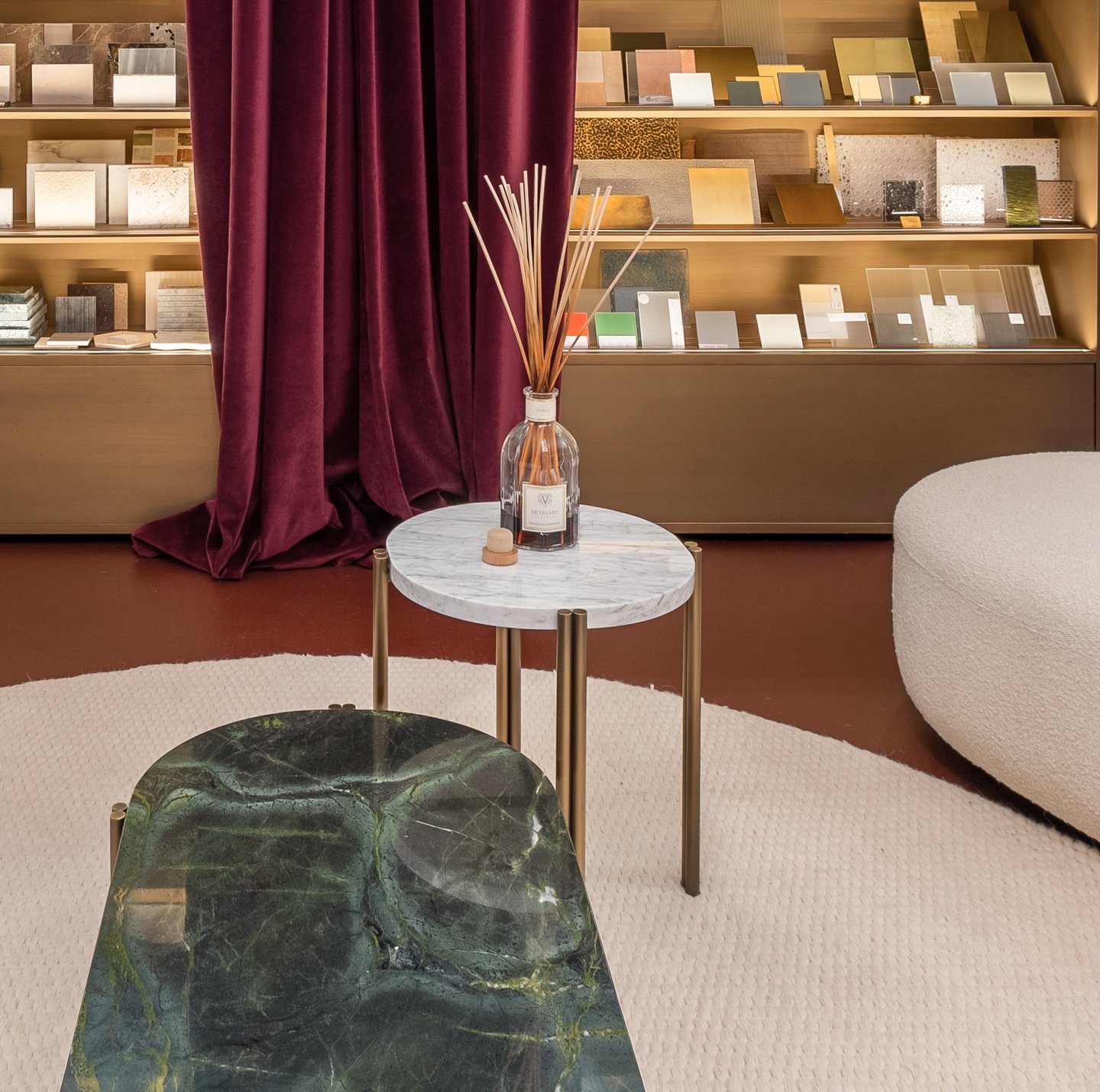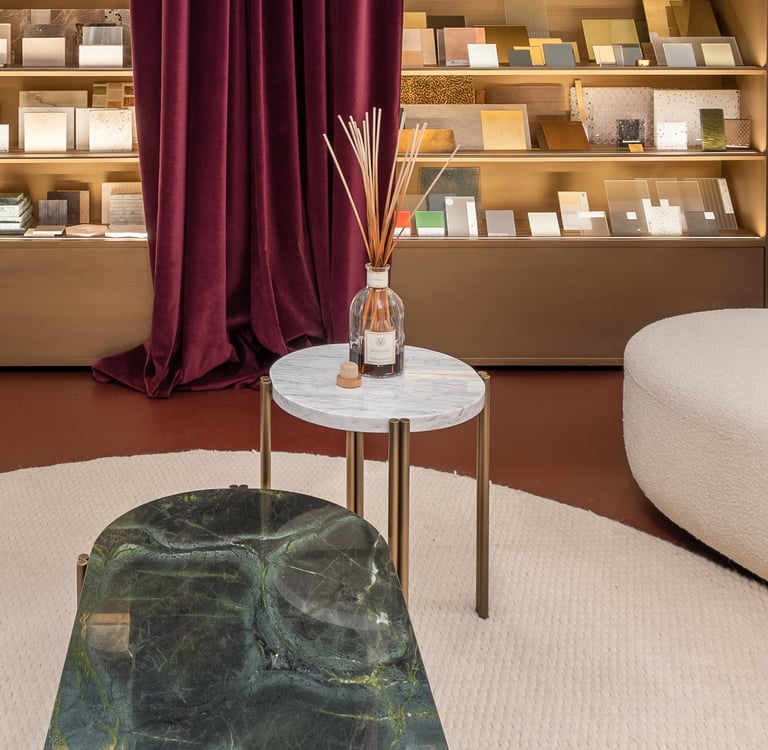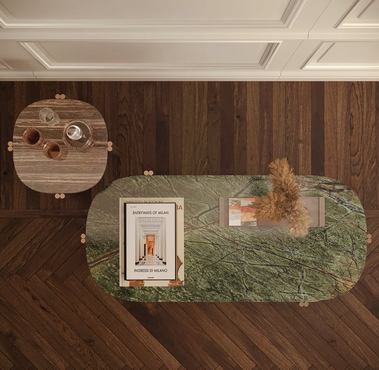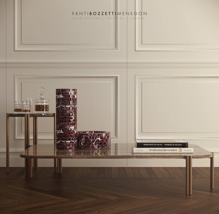 Series of coffee tables in marble and natural brass. The particular asymmetric structure of the legs emphasizes the feeling of lightness of the product, allowing the thickness of the marble to be appreciated. From €2.497,95