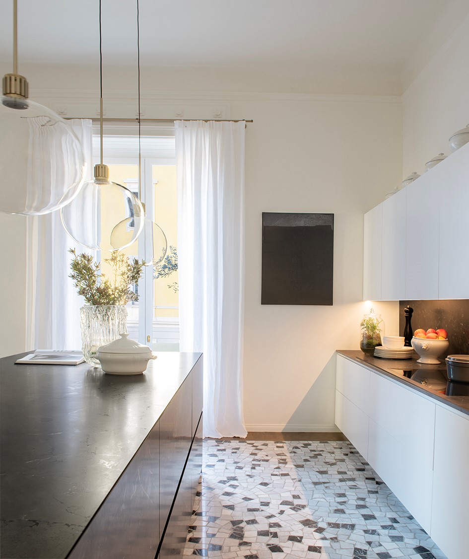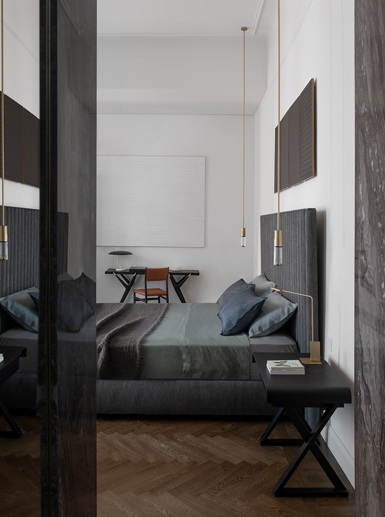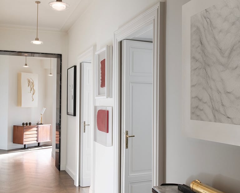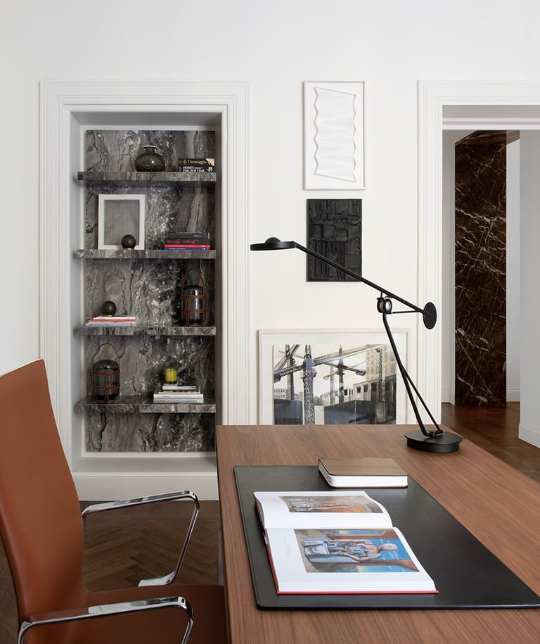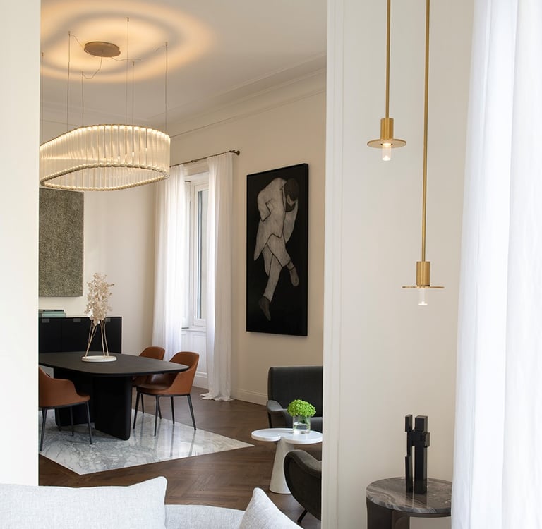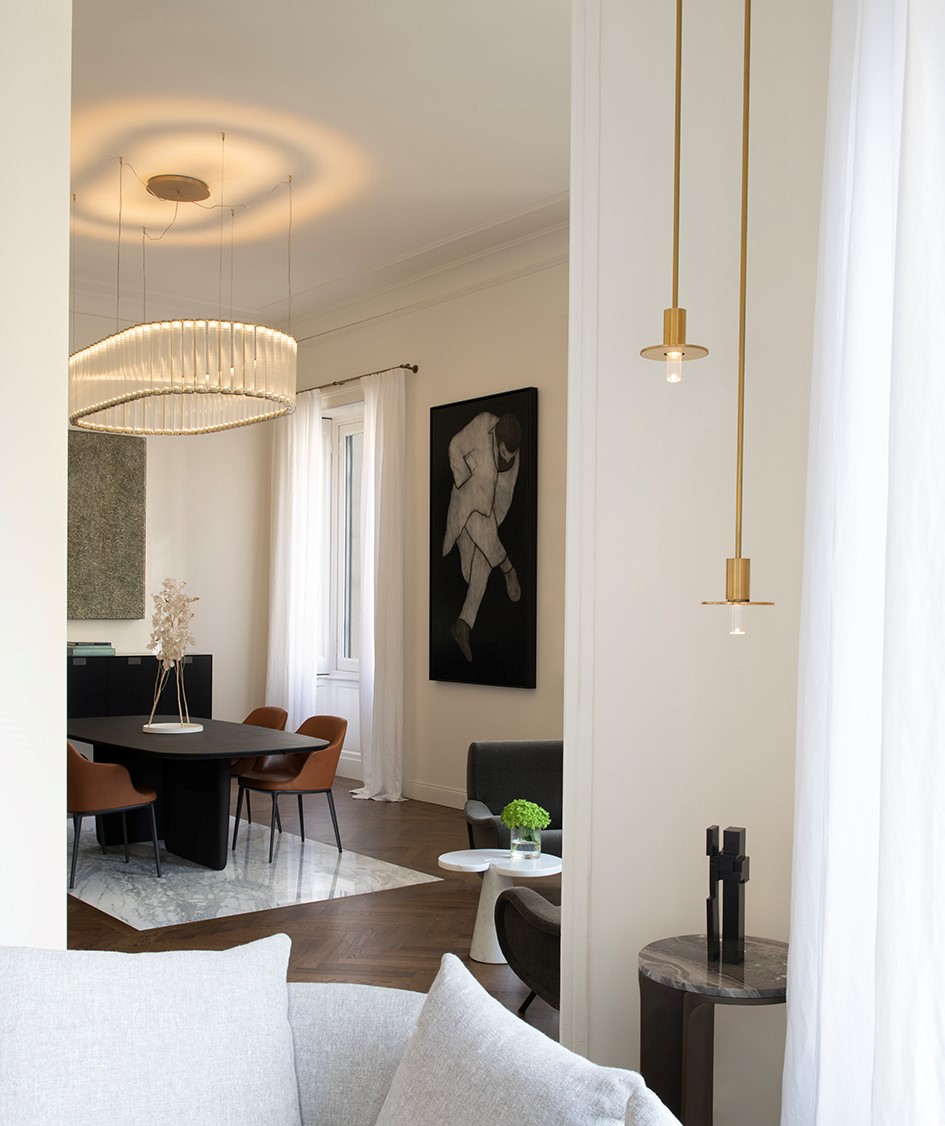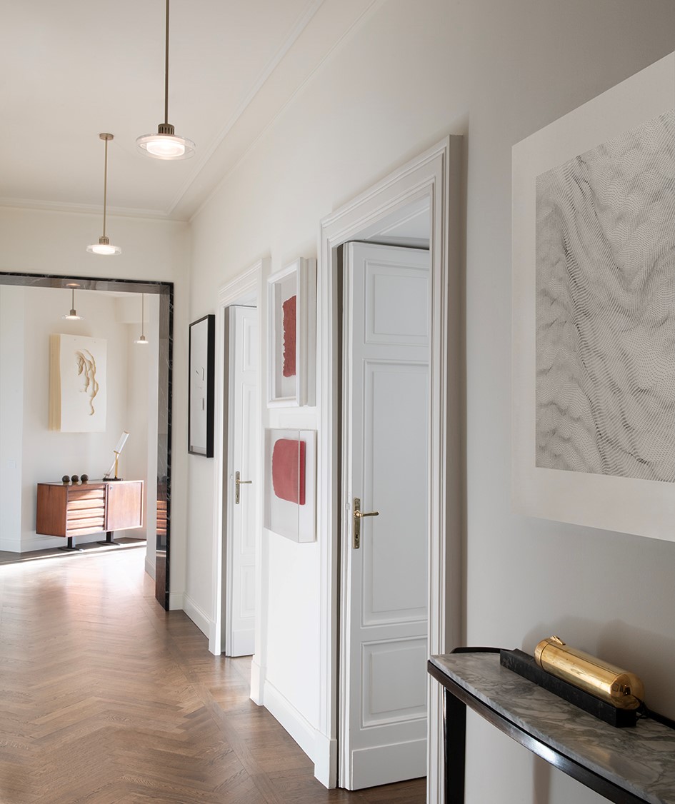 A wonderful apartment overlooking the Arco della Pace of Milan. The restoration of existing ceilings, floors and fixtures has allowed us to maintain the historical flavor of the building from the early 1900s. Sinuous and soft furnishings instill an immediate sense of peace and comfort, the wainscot paneling hides technical rooms and the entire sleeping area where the 3 bedrooms branch off with their bathrooms and walk-in closets. The fully automated lighting offers perfect light scenarios throughout the day by adapting to the external lighting.