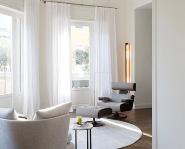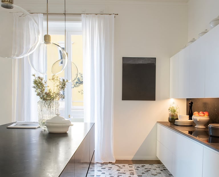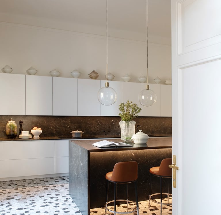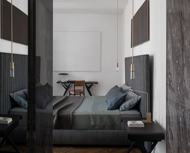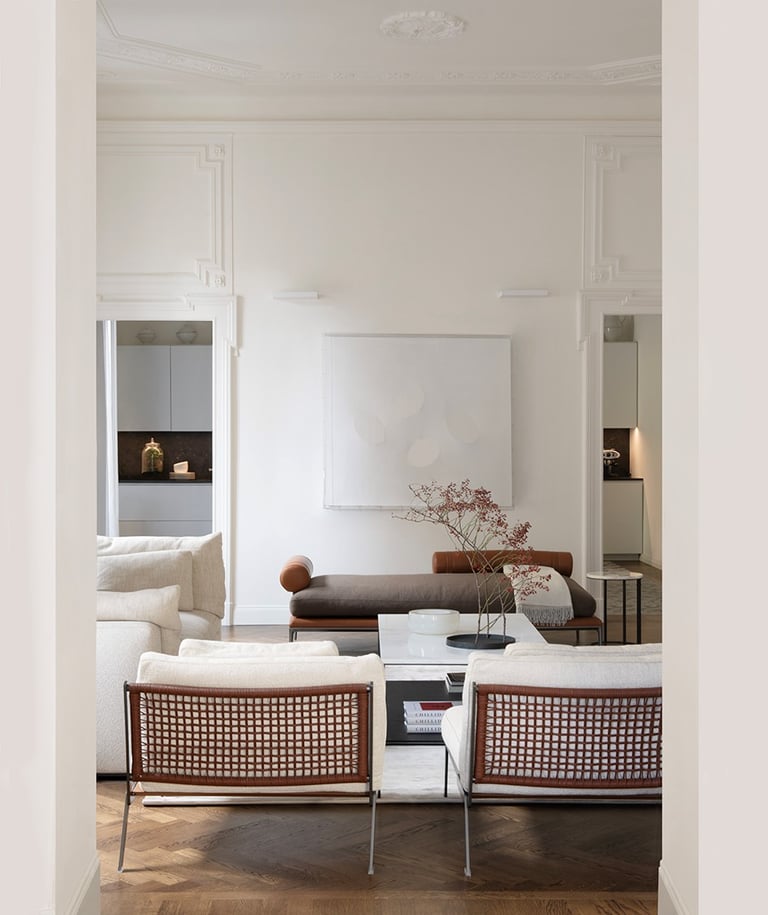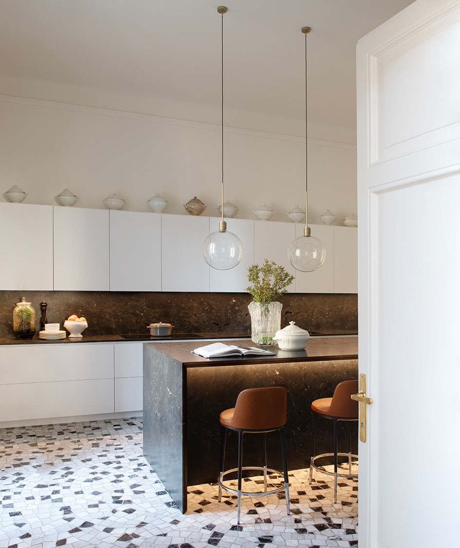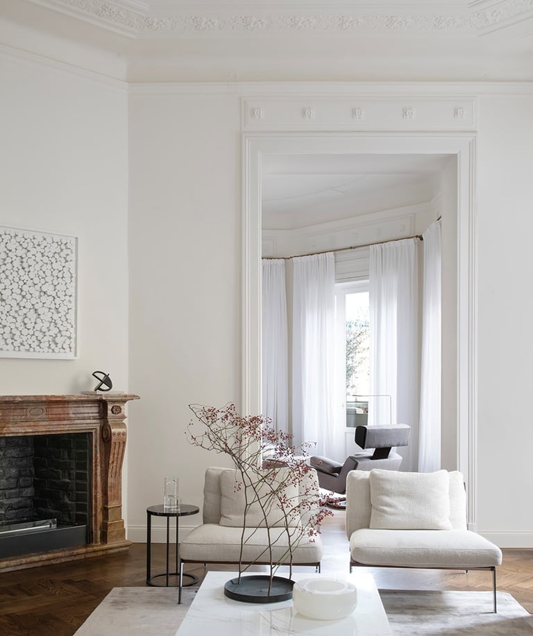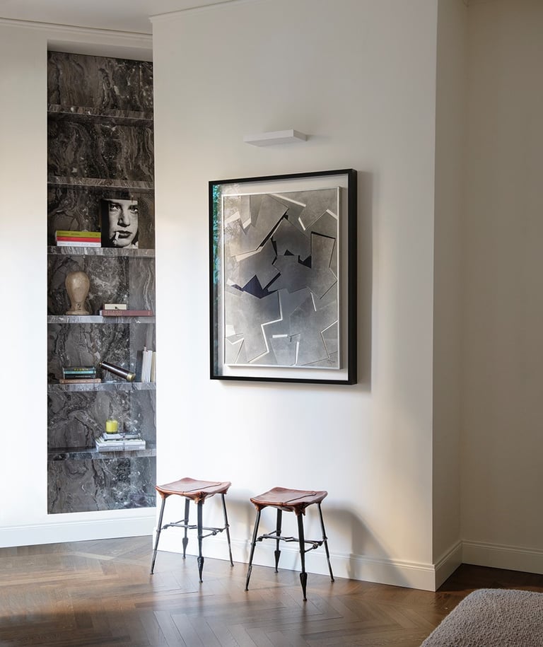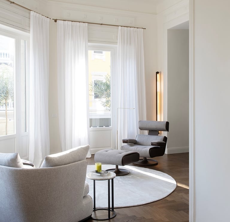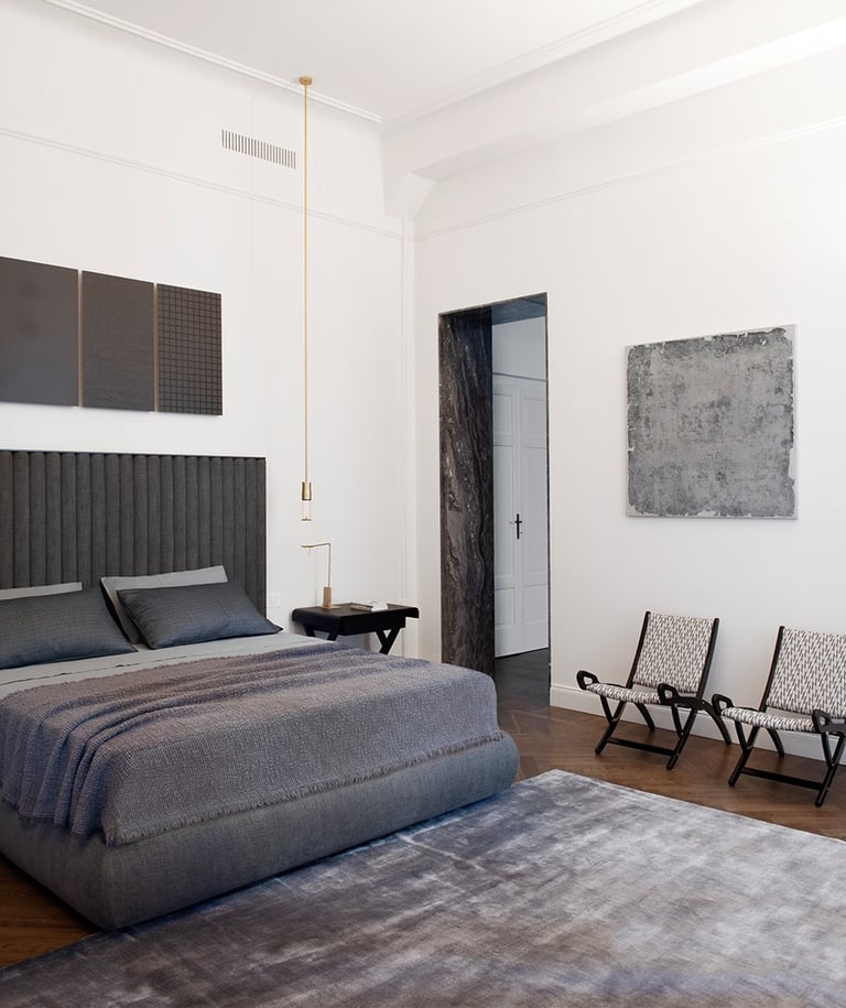 A wonderful apartment overlooking the Arco della Pace of Milan. The restoration of existing ceilings, floors and fixtures has allowed us to maintain the historical flavor of the building from the early 1900s. Sinuous and soft furnishings instill an immediate sense of peace and comfort, the wainscot paneling hides technical rooms and the entire sleeping area where the 3 bedrooms branch off with their bathrooms and walk-in closets. The fully automated lighting offers perfect light scenarios throughout the day by adapting to the external lighting.