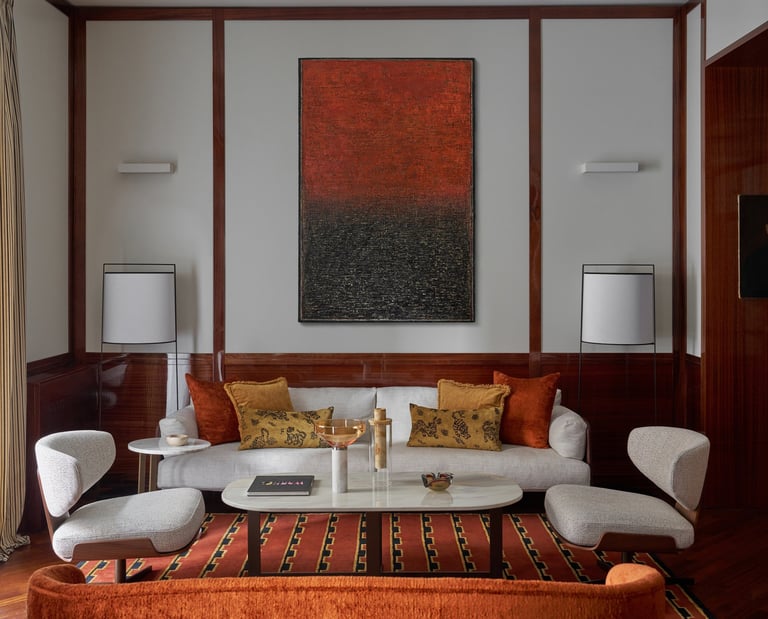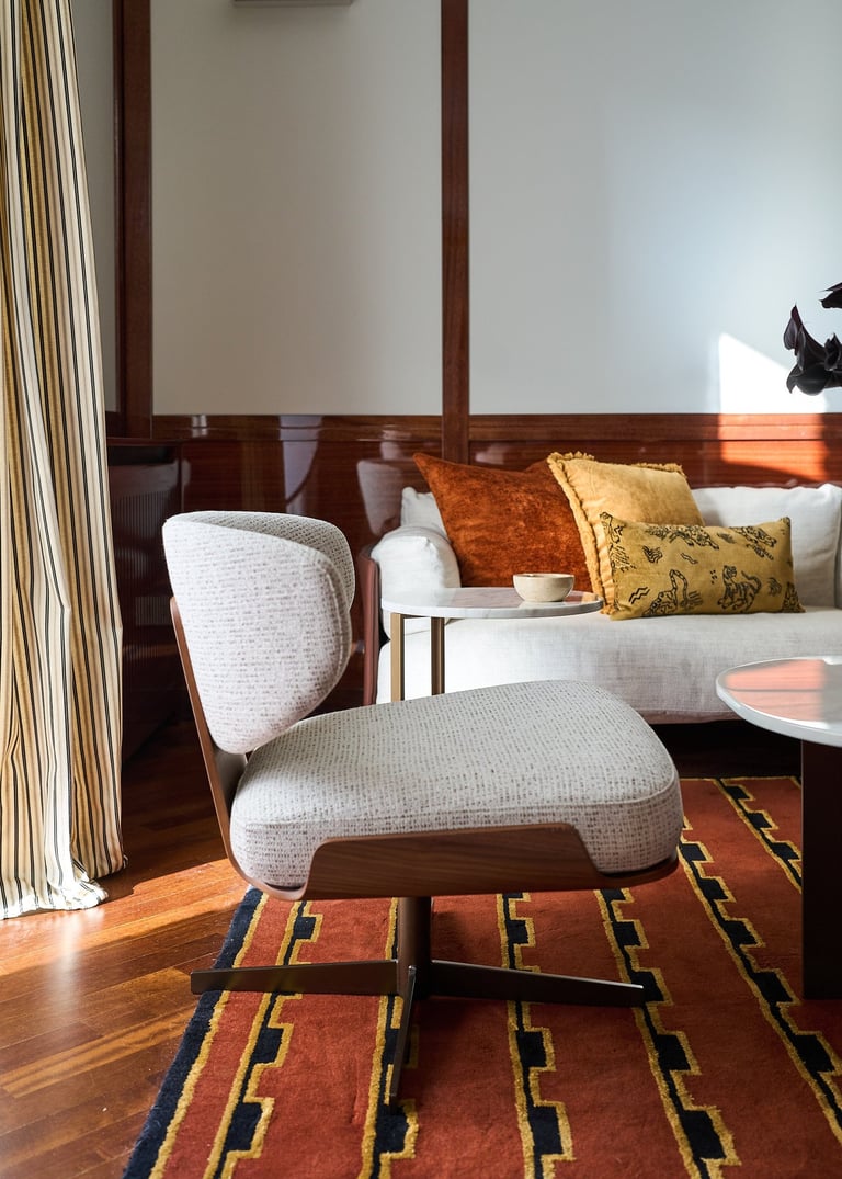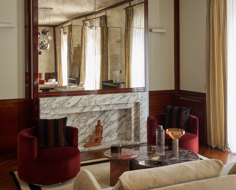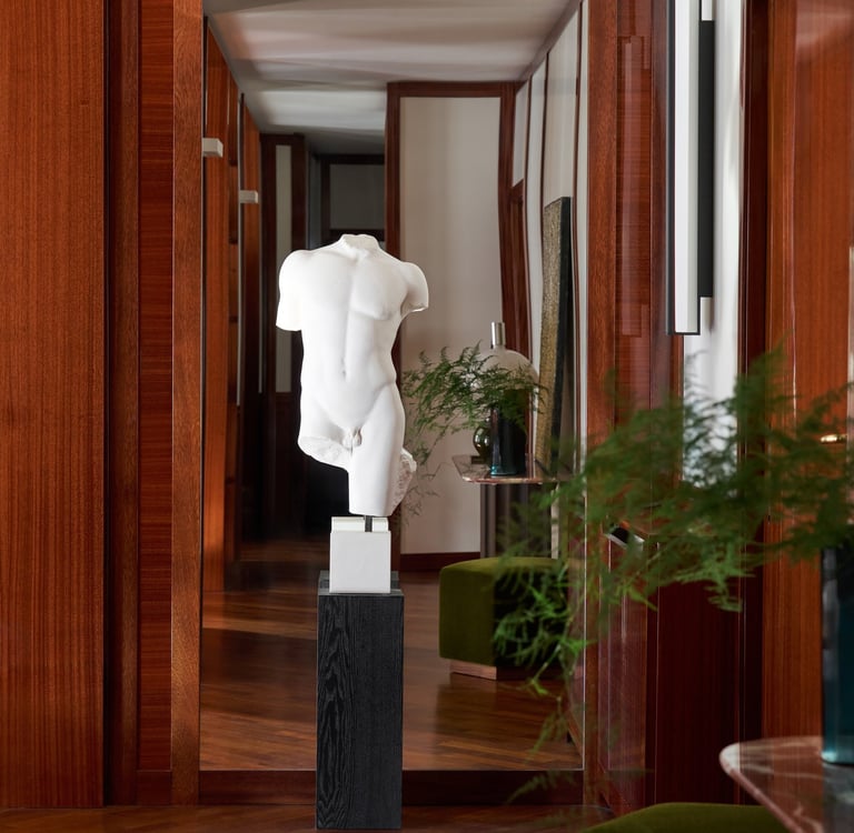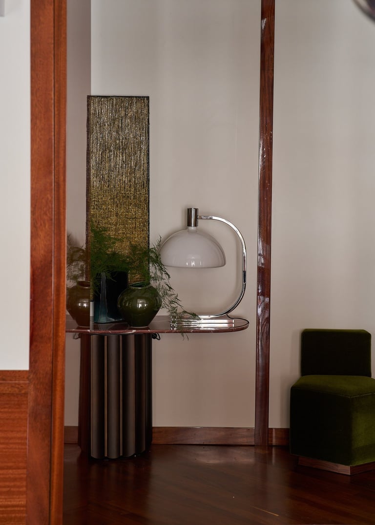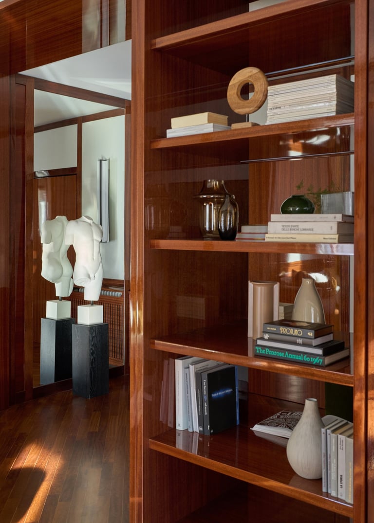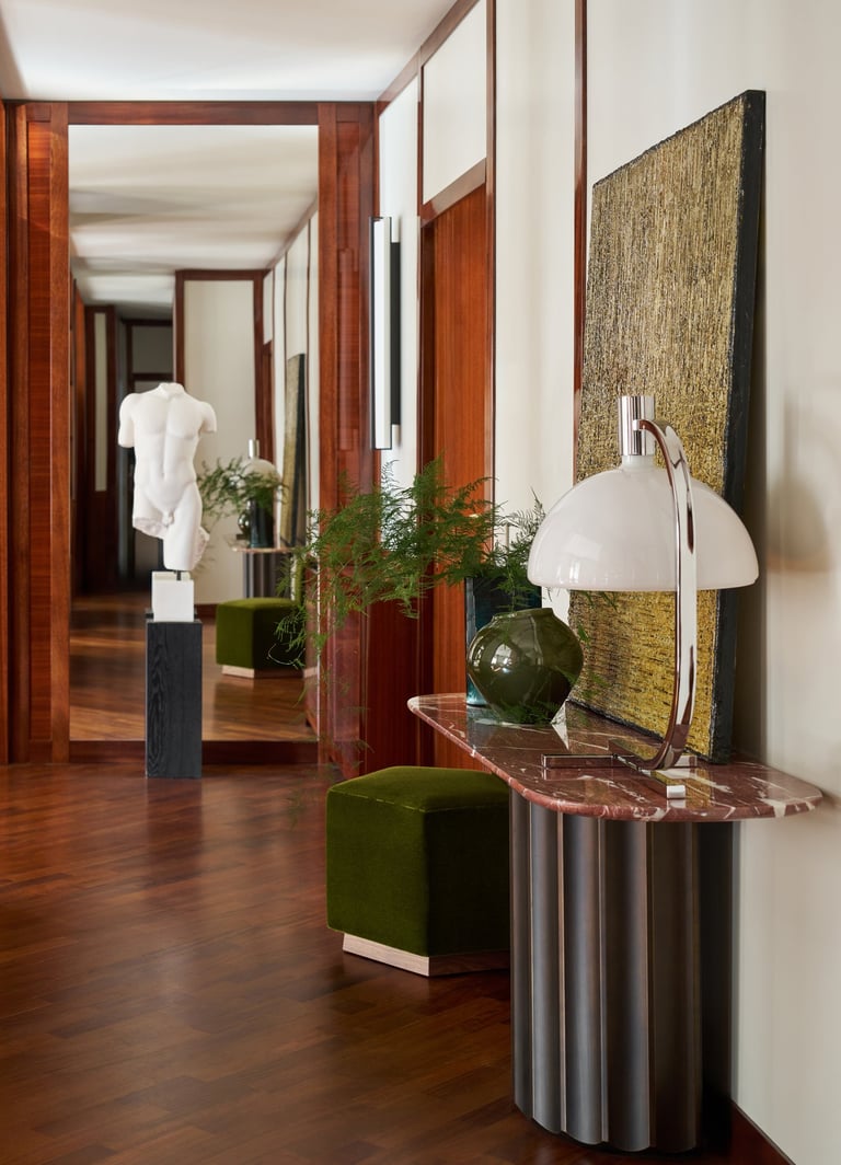 An interior design project where architectural rigor meets material richness, achieving a perfect balance between memory and contemporaneity. The spaces are defined by a rigorous architectural language, softened by warm materials and a tailored attention to detail. Wood, the protagonist of the project, shapes partitions, portals, and custom furnishings, creating visual continuity and spatial depth.