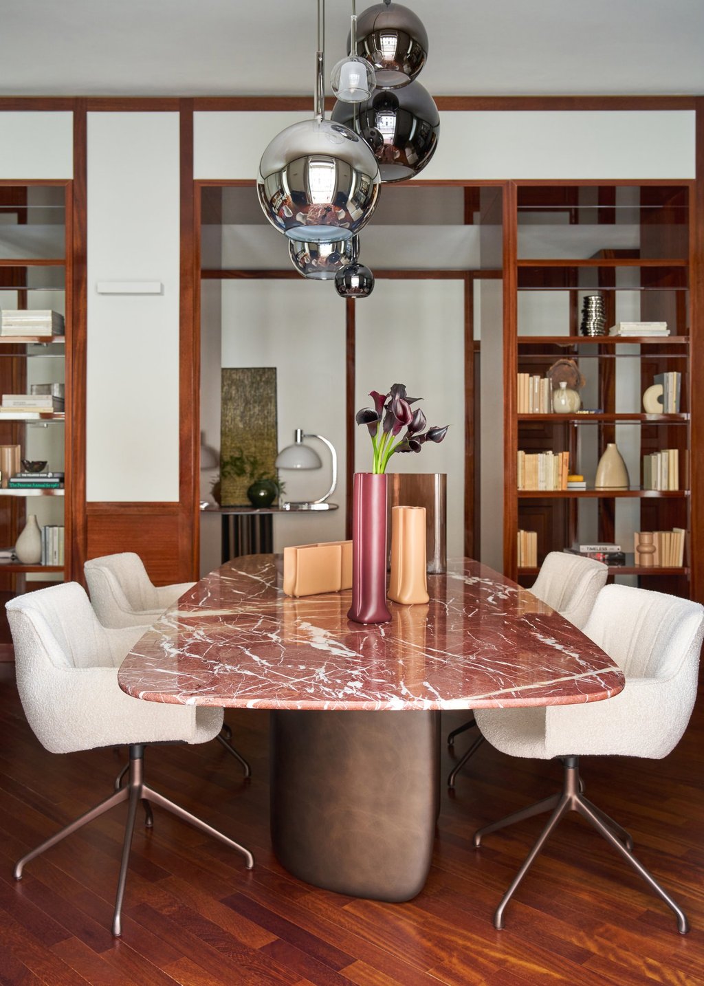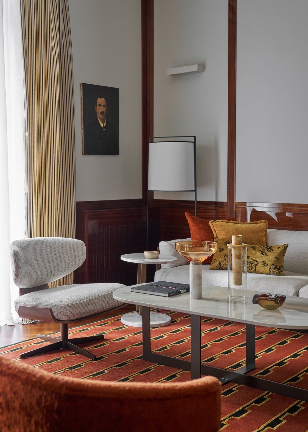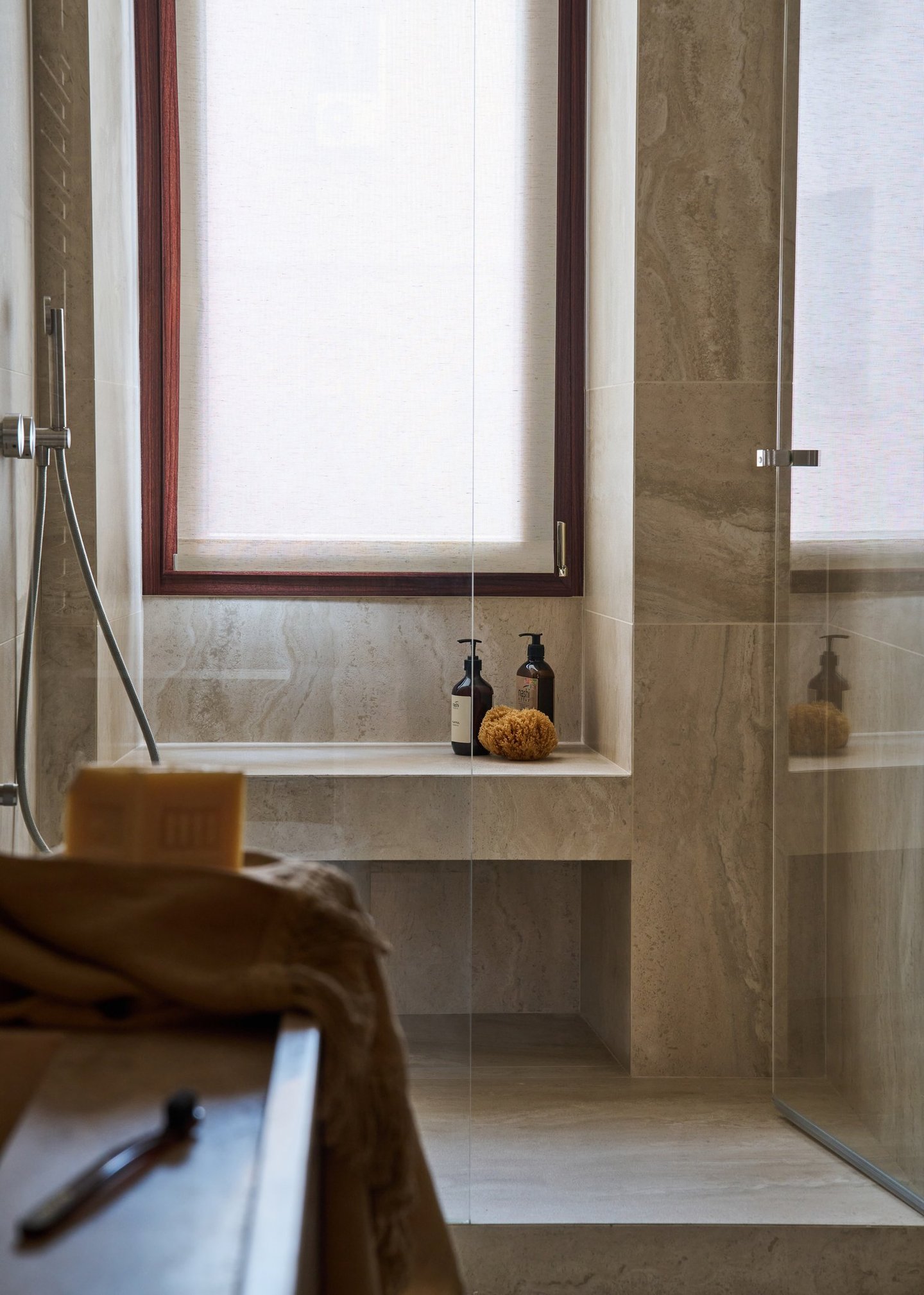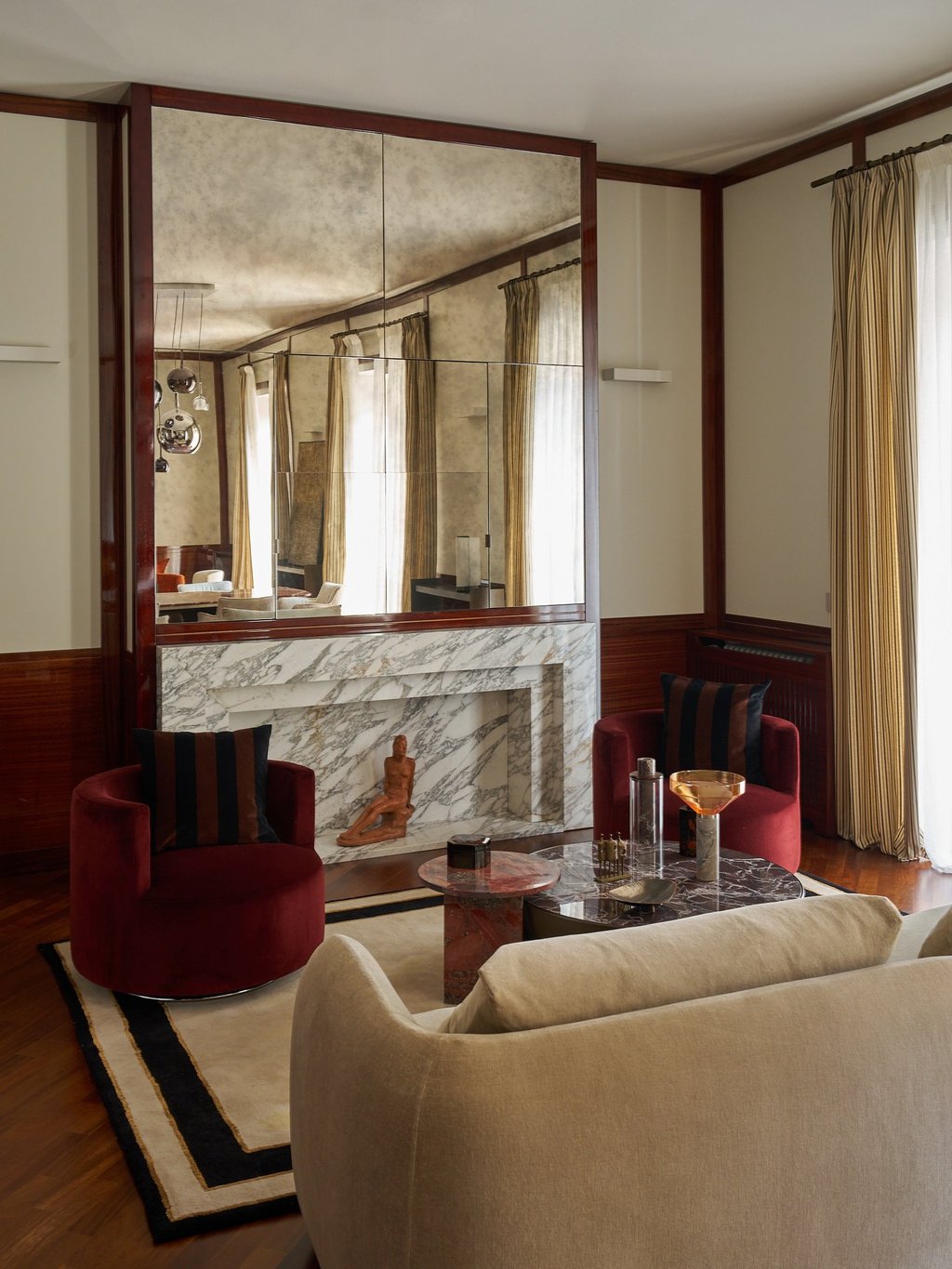 An interior design project where architectural rigor meets material richness, achieving a perfect balance between memory and contemporaneity. The spaces are defined by a rigorous architectural language, softened by warm materials and a tailored attention to detail. Wood, the protagonist of the project, shapes partitions, portals, and custom furnishings, creating visual continuity and spatial depth.
