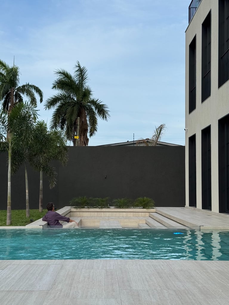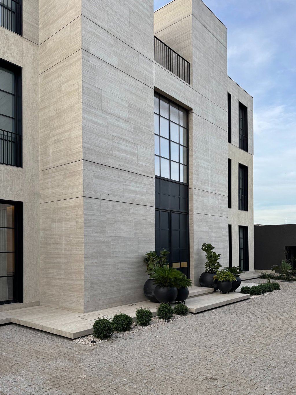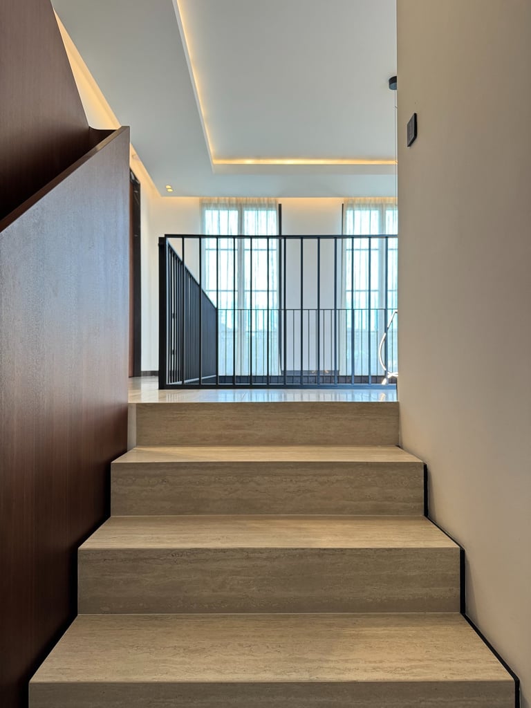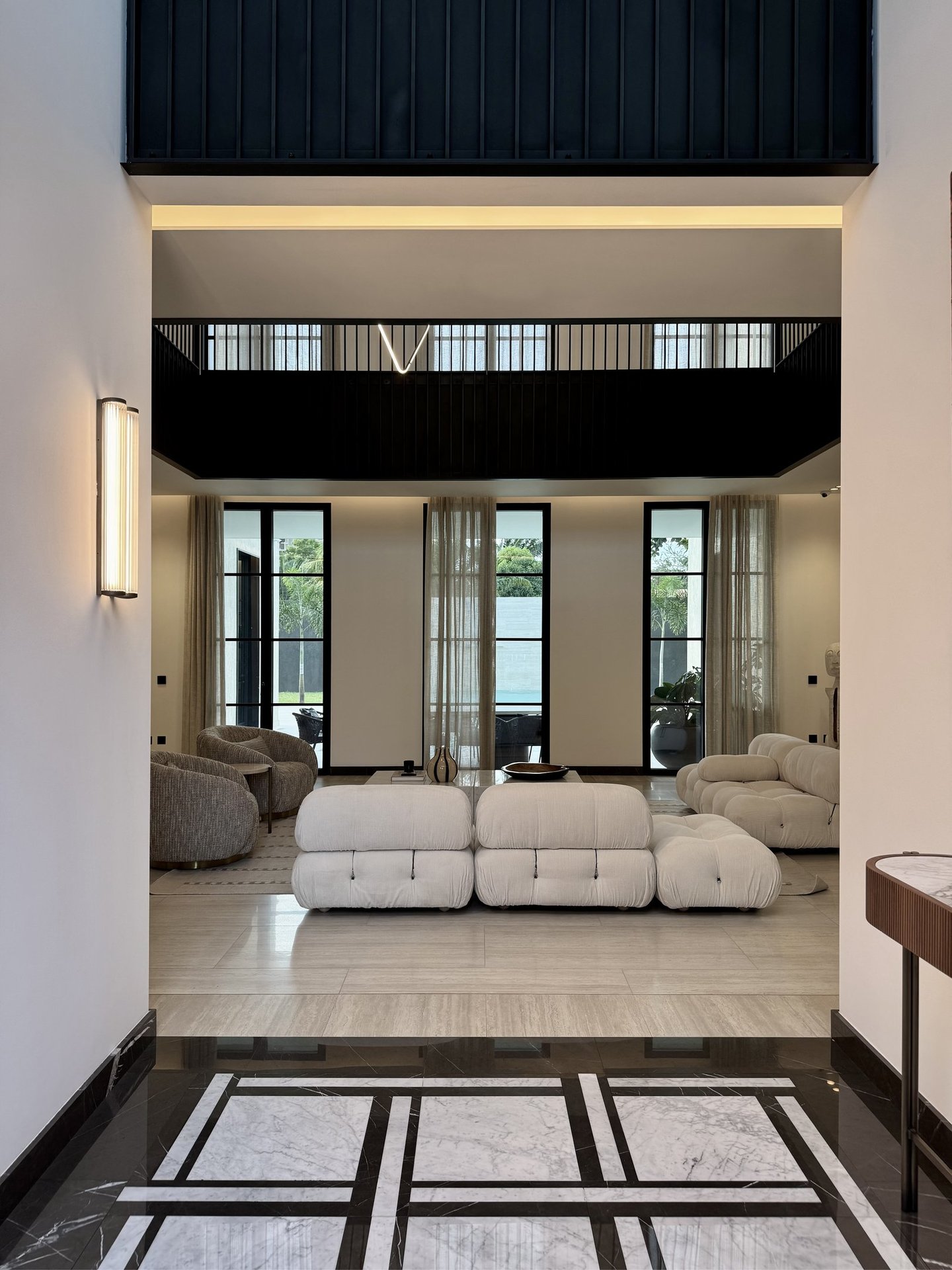 The project was inspired by a specific customer request, a single-family villa with a classic look. Taking up the principles of the Palladian villas of the early 19th century, the project is spread over 4 floors with a system of windows that are all symmetrical and equidistant, transforming the internal courtyard into a continuation of the large swimming pool that visually stands out inside the living room. The underground outdoor areas emphasize the view of the garden from inside the ground floor. The external covering materials are clean and elegant, the dichotomy between the white of the travertine and the black of the aluminum of the linings emphasize the architectural lights of the building. Inside, symmetrical compasses on the central living room lead you through the various rooms.