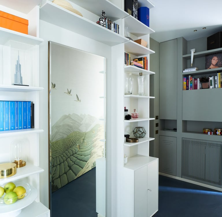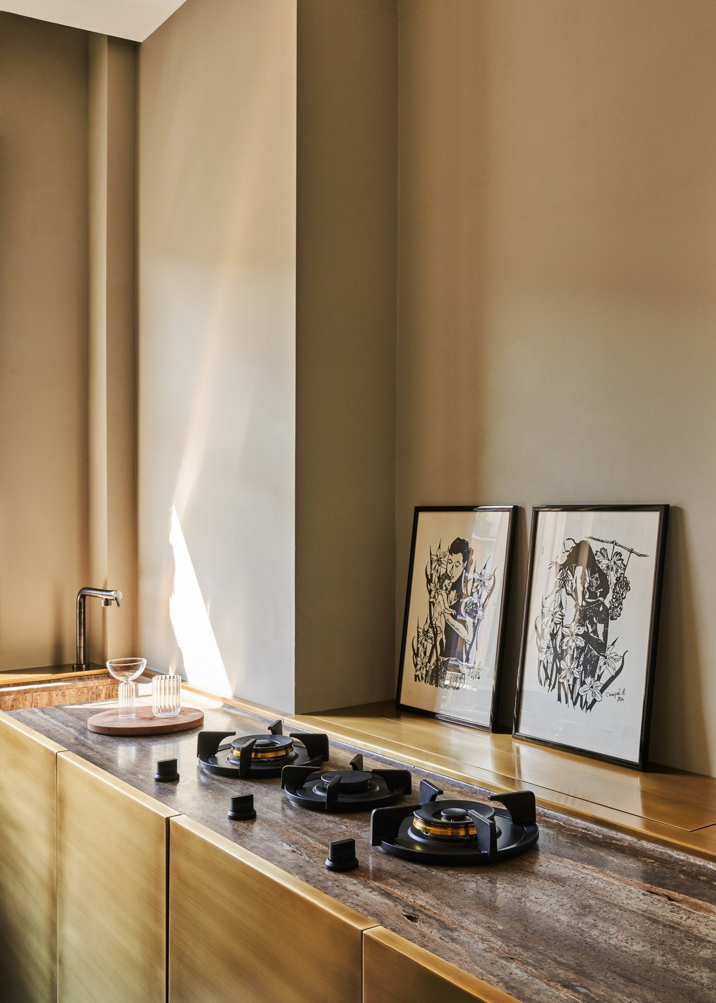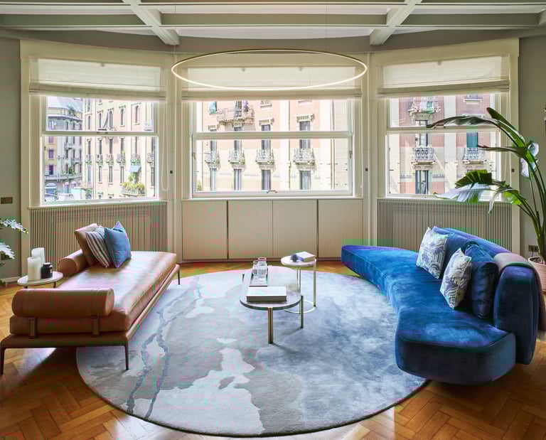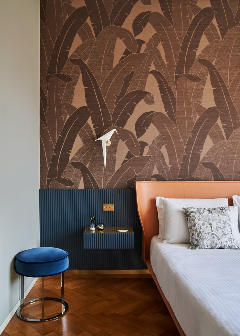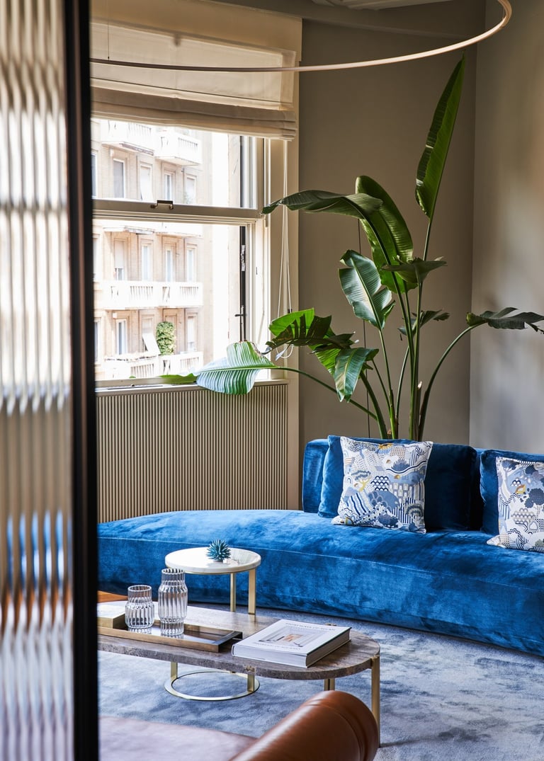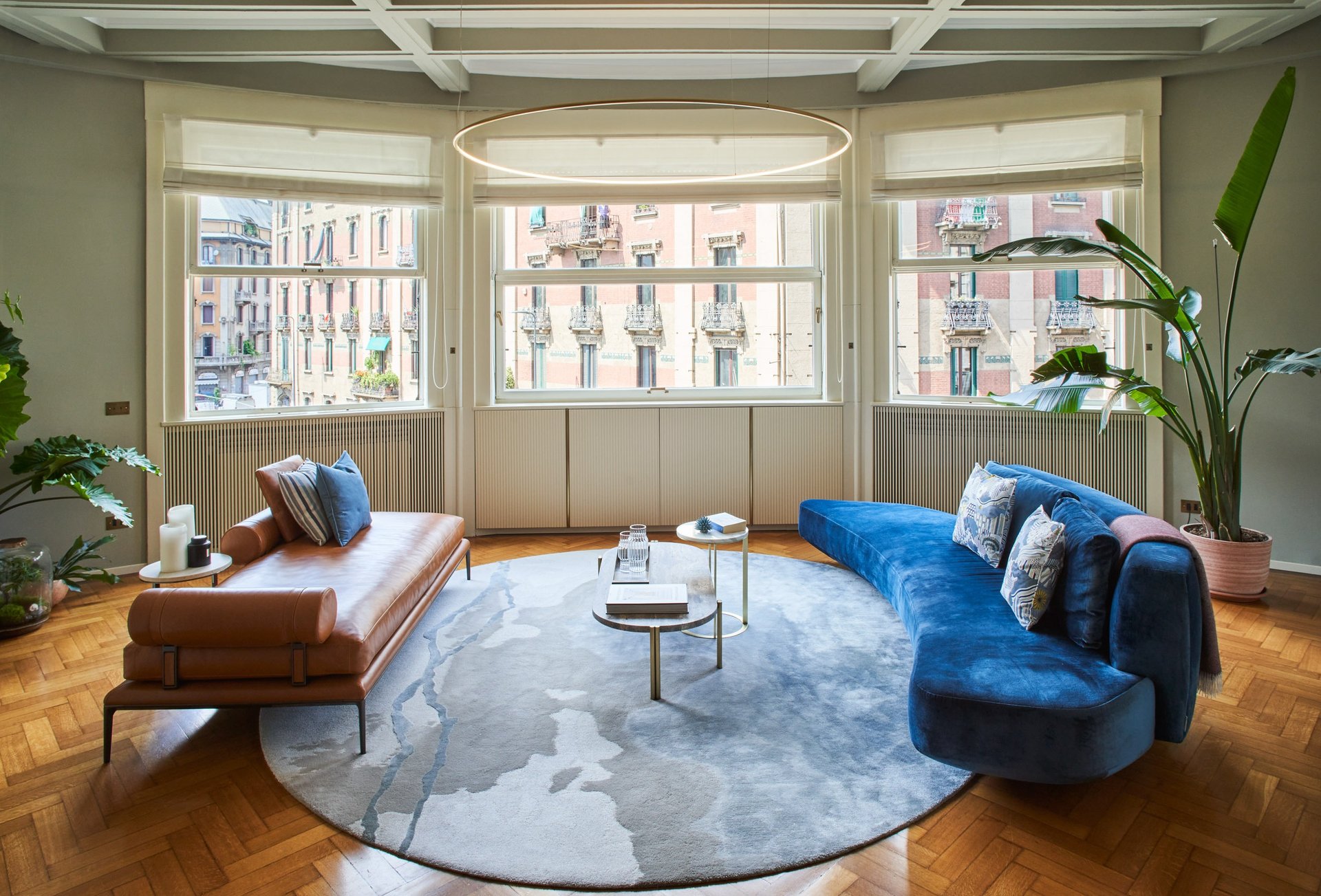 A small 100m2 apartment in a classic Milanese building from the early 1900s distributed around a large and spectacular fan-shaped living room with triple glazing capable of recreating the charm of a bow window. The parquet floors laid in a herringbone pattern, some curved walls typical of the deco period and a few other architectural details have been restored to bring them back to their original splendor; the rest has been completely redesigned with contemporary materials and colors but with a retro charm that recall the bourgeois interiors of the 1930s and cite the fashion of that era. Thus the walls are covered with works of art, wallpaper and boiserie with sophisticated geometric designs that bring the space to life. Velvets and precious finishes are offered in blue and cognac: The timeless elegance of this color combination is repeated in all the rooms of the house embellished by the golden reflections of the kitchen entirely in natural brass or by the Carrara marble pipes of the master bathroom.