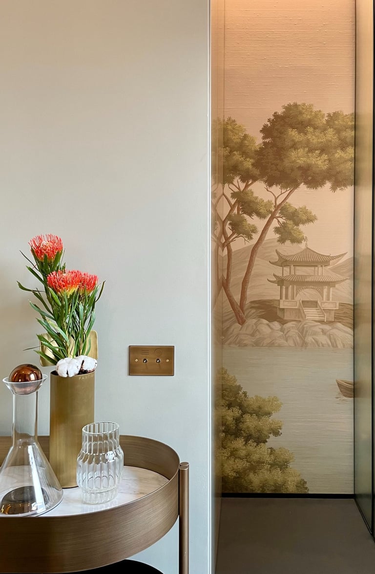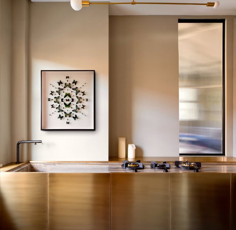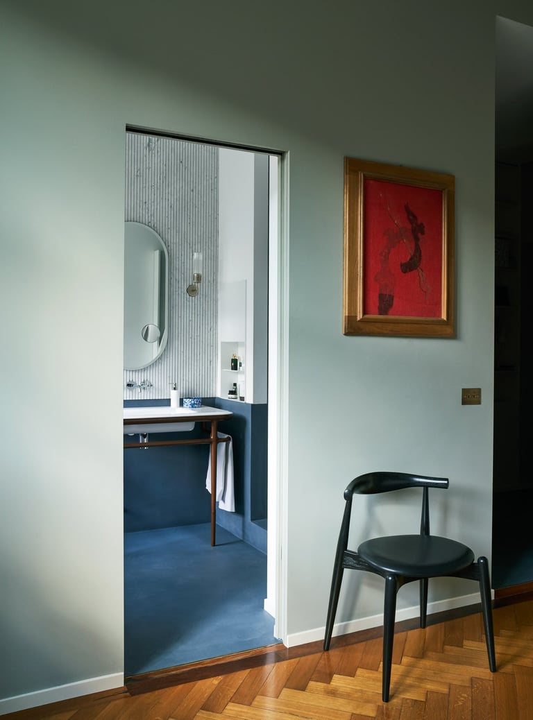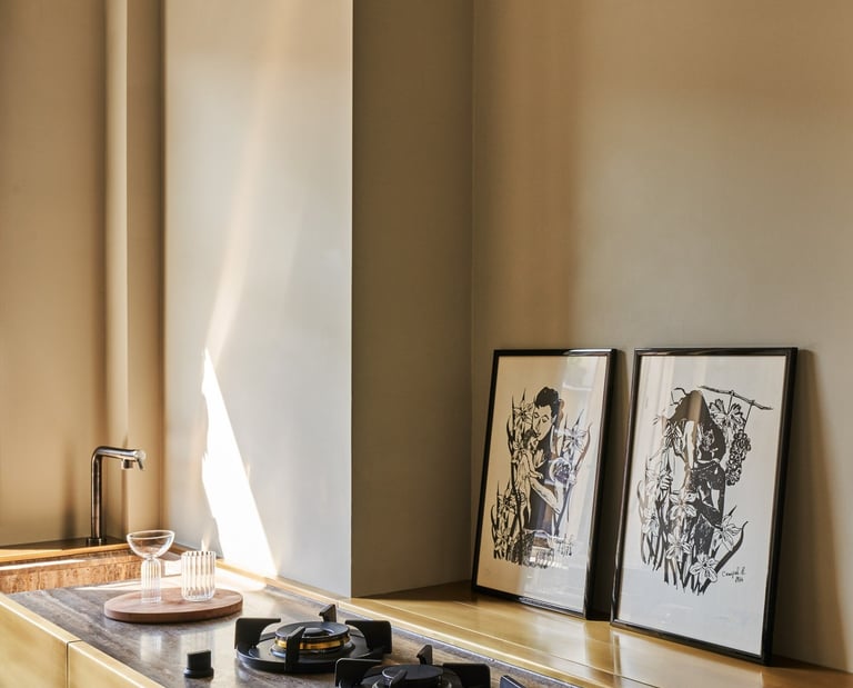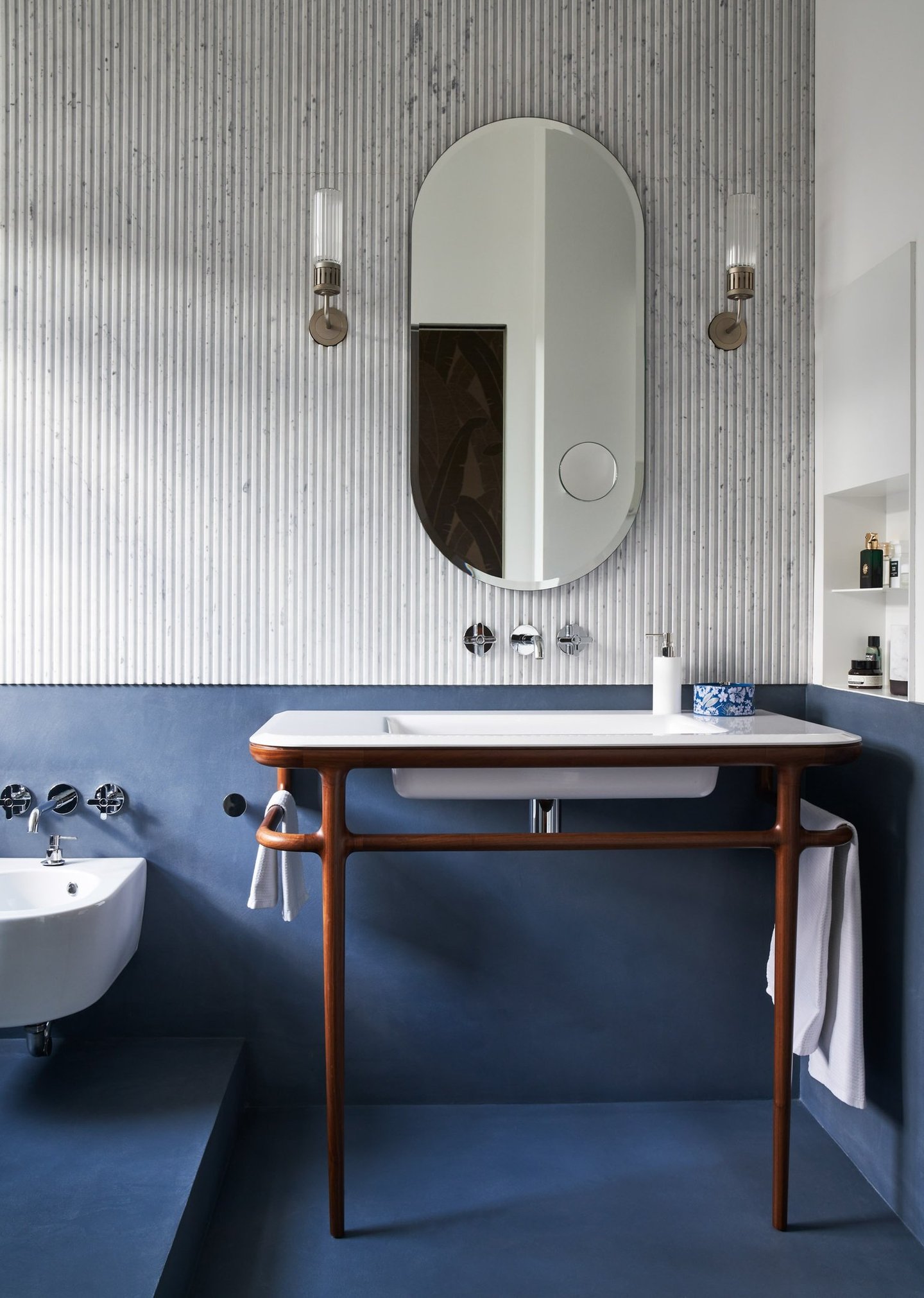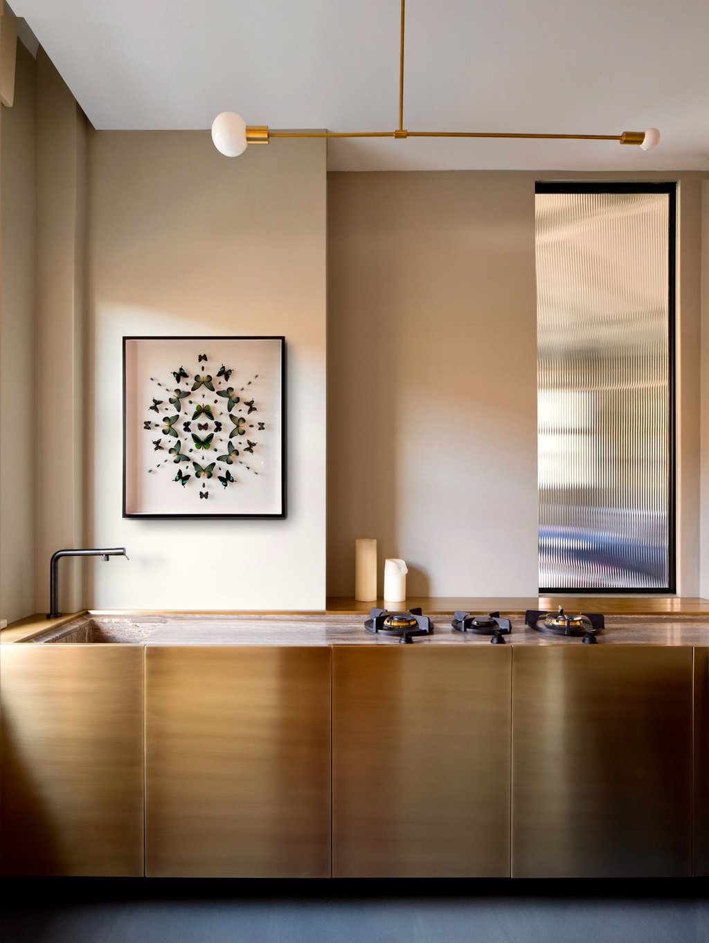 A small 100m2 apartment in a classic Milanese building from the early 1900s distributed around a large and spectacular fan-shaped living room with triple glazing capable of recreating the charm of a bow window. The parquet floors laid in a herringbone pattern, some curved walls typical of the deco period and a few other architectural details have been restored to bring them back to their original splendor; the rest has been completely redesigned with contemporary materials and colors but with a retro charm that recall the bourgeois interiors of the 1930s and cite the fashion of that era. Thus the walls are covered with works of art, wallpaper and boiserie with sophisticated geometric designs that bring the space to life. Velvets and precious finishes are offered in blue and cognac: The timeless elegance of this color combination is repeated in all the rooms of the house embellished by the golden reflections of the kitchen entirely in natural brass or by the Carrara marble pipes of the master bathroom.