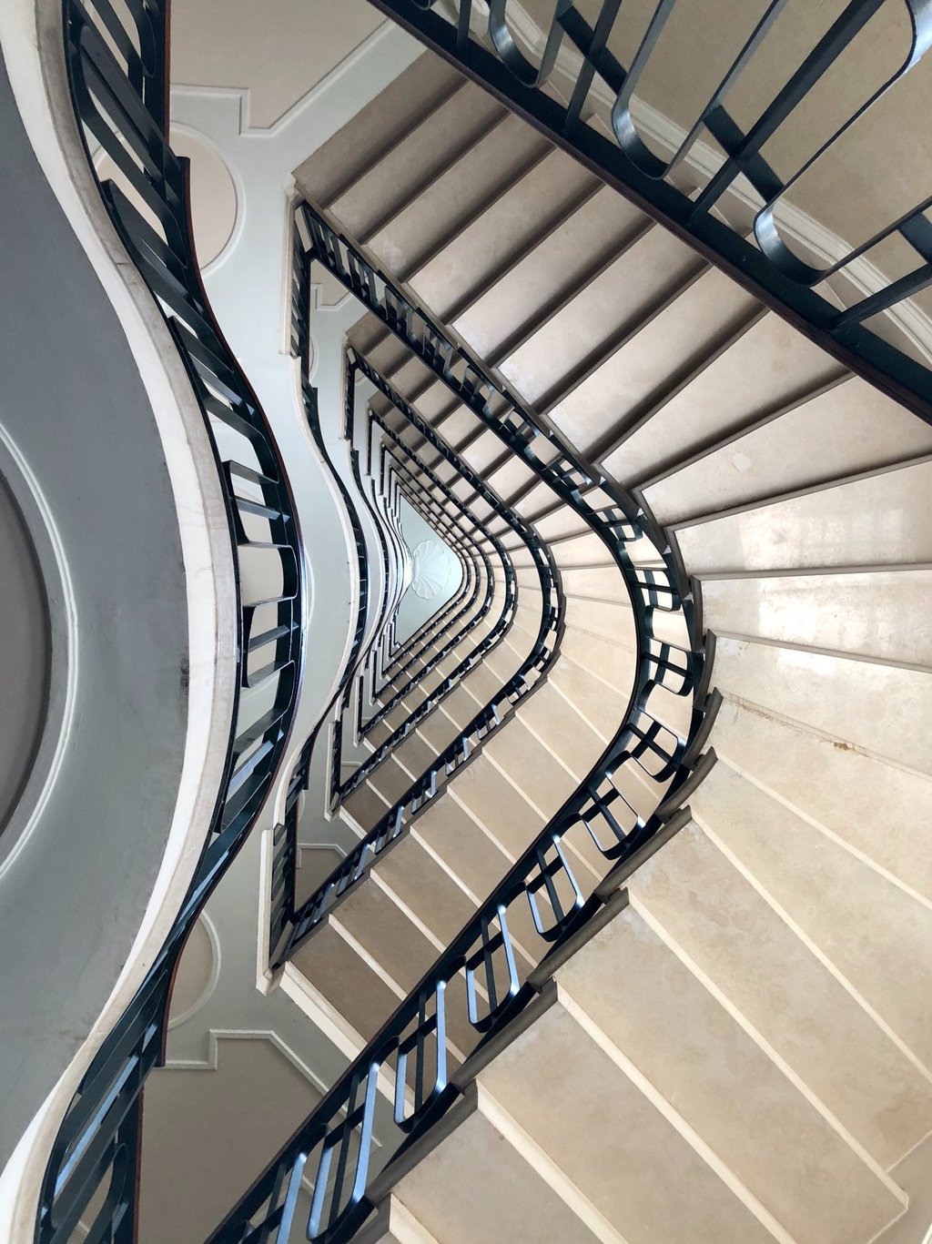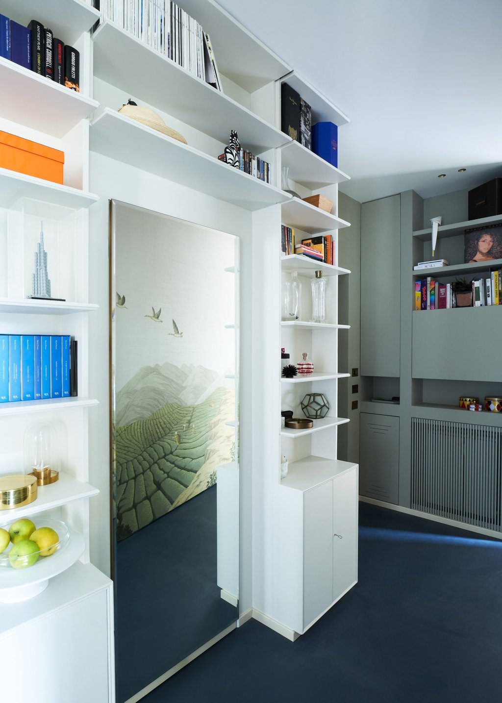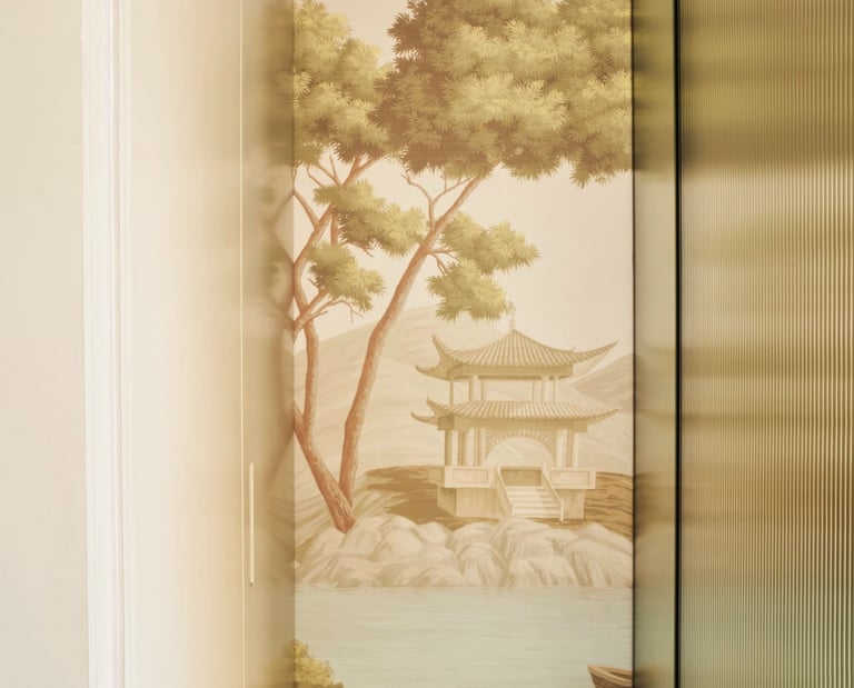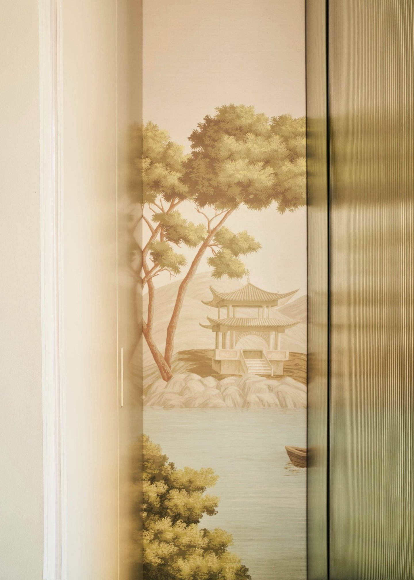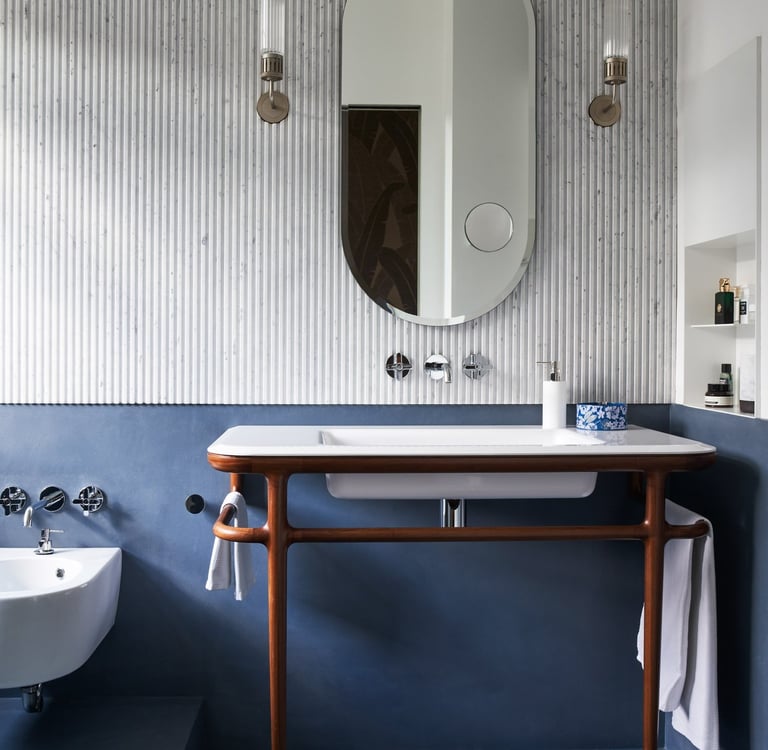 A small 100m2 apartment in a classic Milanese building from the early 1900s distributed around a large and spectacular fan-shaped living room with triple glazing capable of recreating the charm of a bow window. The parquet floors laid in a herringbone pattern, some curved walls typical of the deco period and a few other architectural details have been restored to bring them back to their original splendor; the rest has been completely redesigned with contemporary materials and colors but with a retro charm that recall the bourgeois interiors of the 1930s and cite the fashion of that era. Thus the walls are covered with works of art, wallpaper and boiserie with sophisticated geometric designs that bring the space to life. Velvets and precious finishes are offered in blue and cognac: The timeless elegance of this color combination is repeated in all the rooms of the house embellished by the golden reflections of the kitchen entirely in natural brass or by the Carrara marble pipes of the master bathroom.