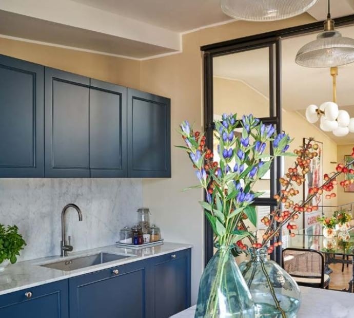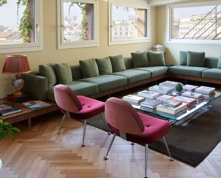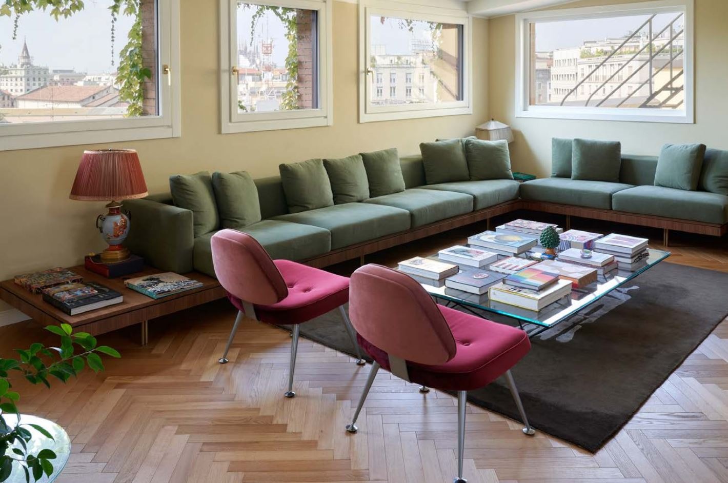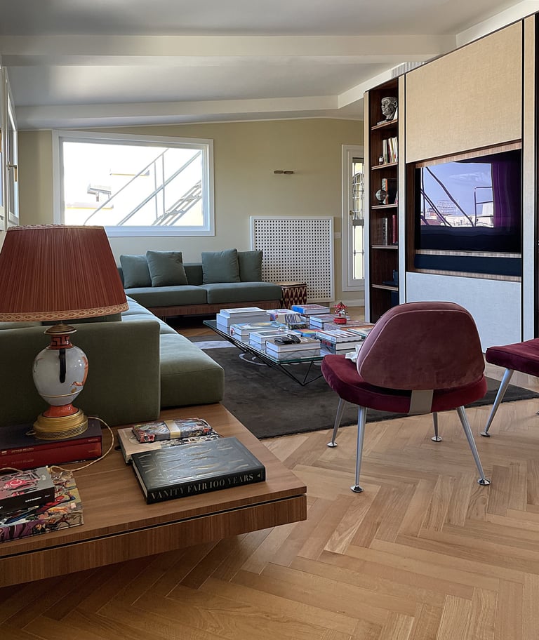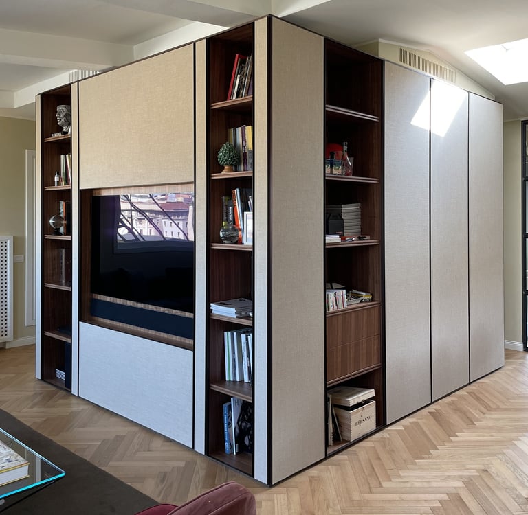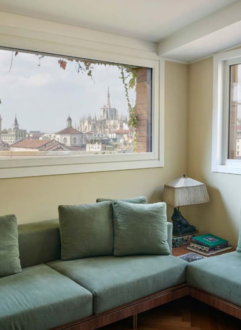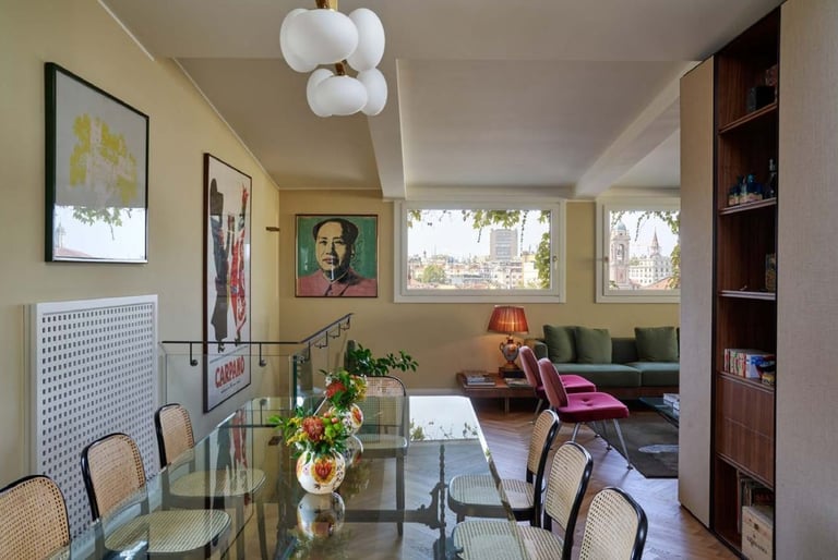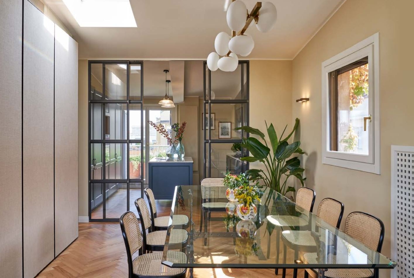 Over 200 m2 of apartment on 3 levels in the heart of Milan overlooking the Duomo cathedral. The living area spaces are developed around a central volume entirely made of canaletto walnut and covered in natural raffia. Inside there are a walk-in closet for guests, a bathroom and a wet bar. The kitchen and bedrooms were created with completely custom-made furnishings in full, dusty colors embellished with fine materials and pantographed doors. Two large terraces furnished with wrought iron furniture give vent to the need for greenery typical of the city centre.