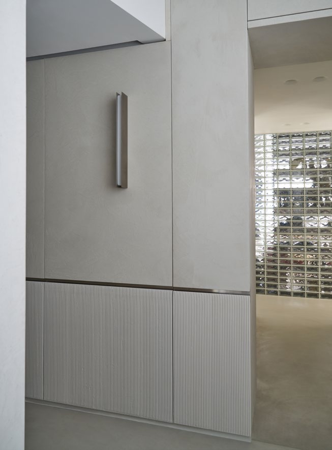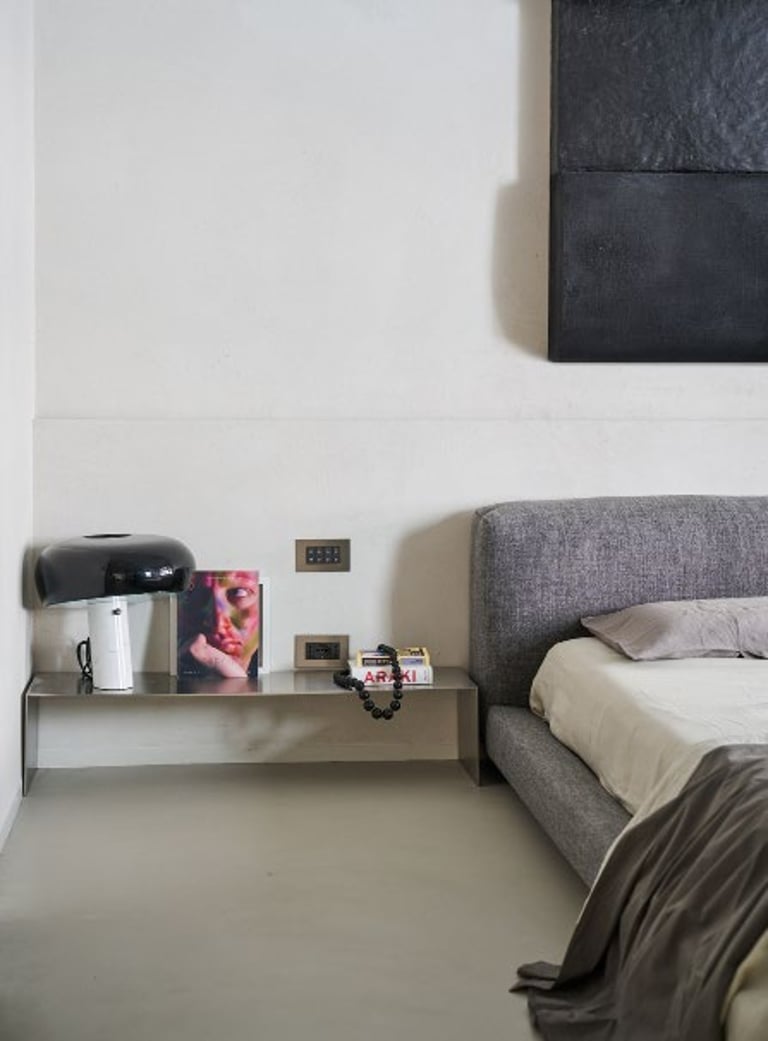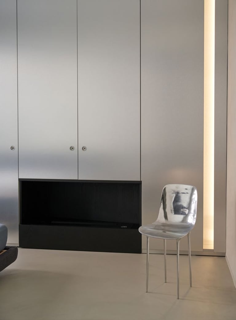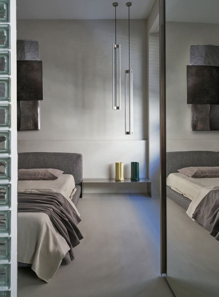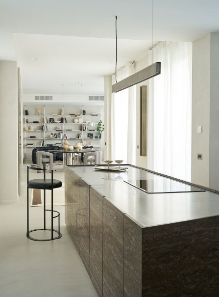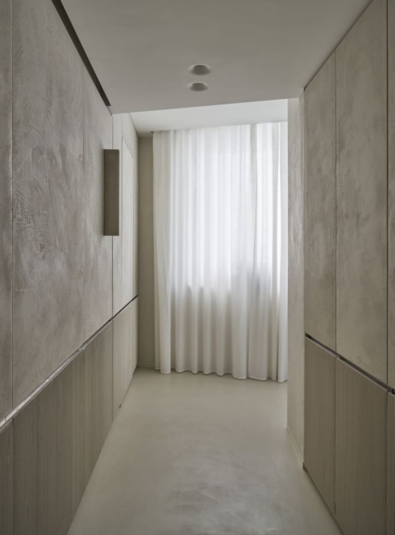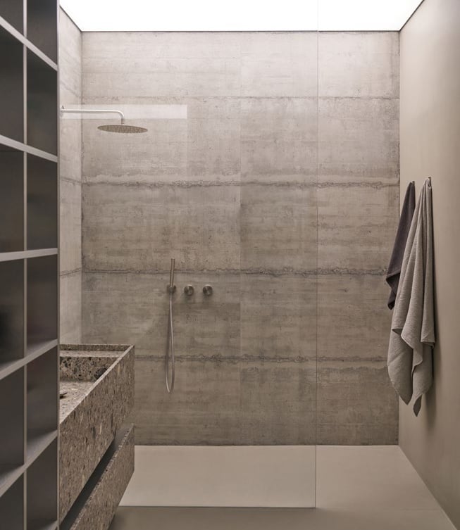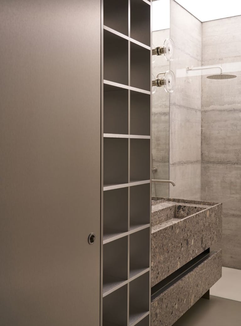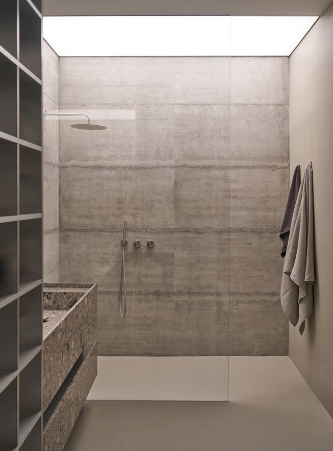 A three bedroom Brutalist apartment in the heart of Milan. The concept includes materials such as concrete, glass, iranian travertine marble, steel and resin. Light plays a fundamental role, the spotlights are softly recessed in the ceiling, almost disappearing and the large shower in the master has a ceiling entirely in barrisol creating this particularly emotional zenithal light effect.
