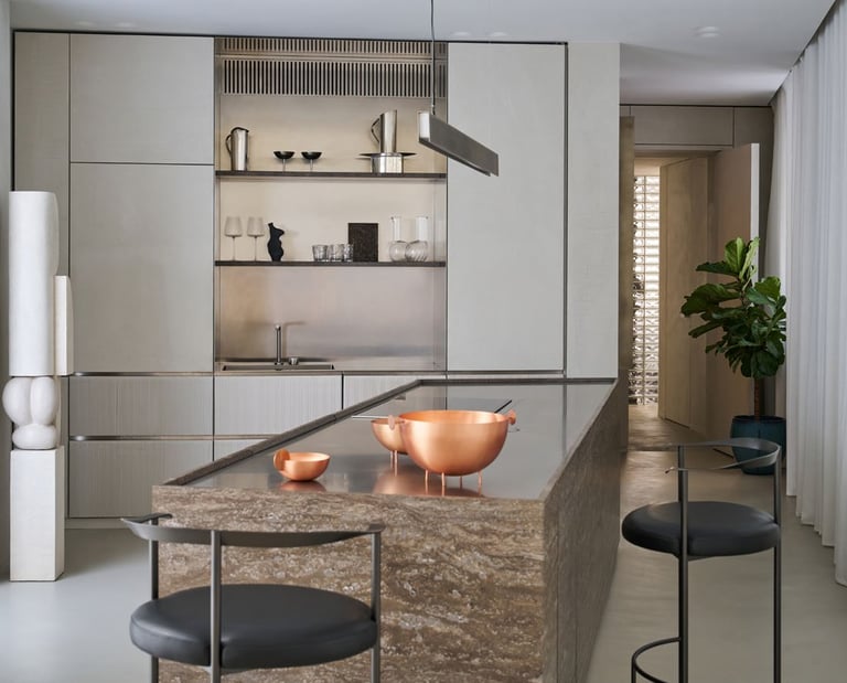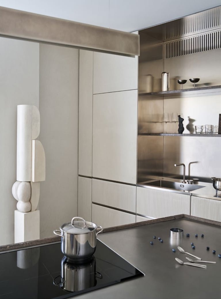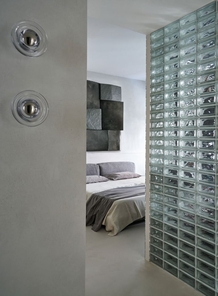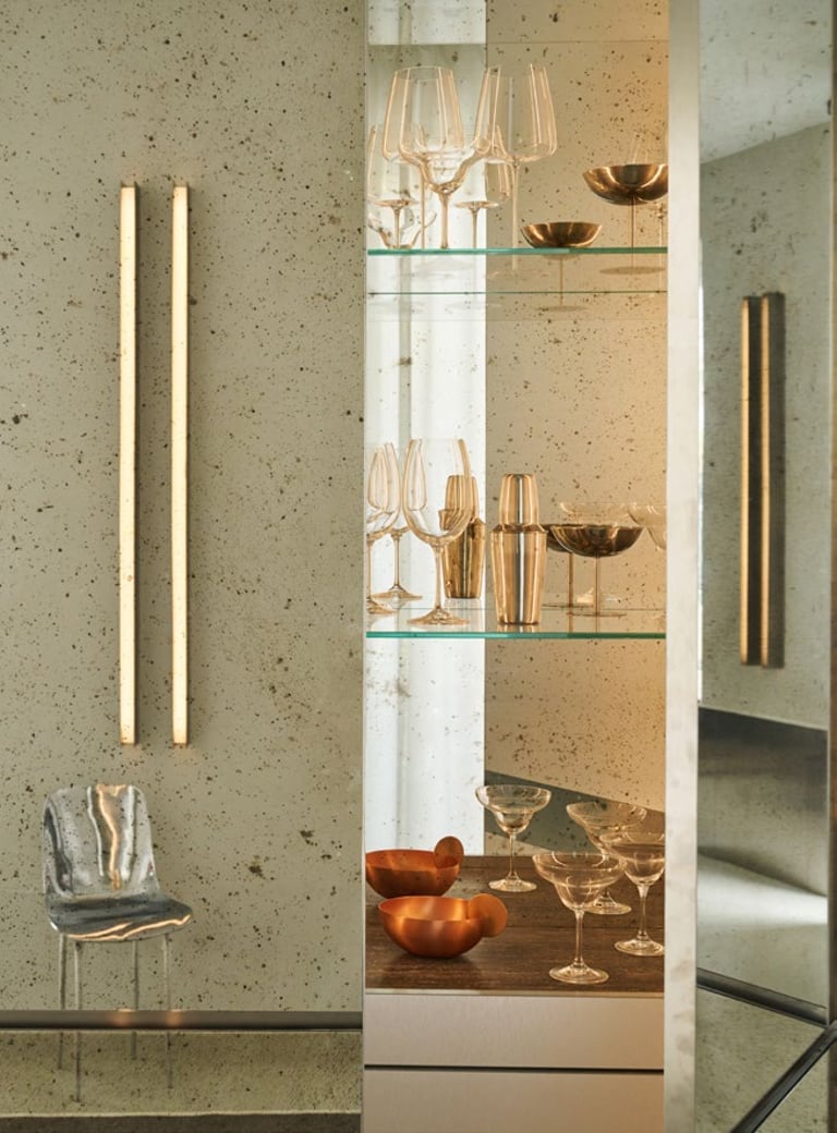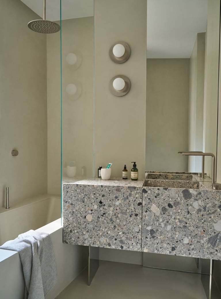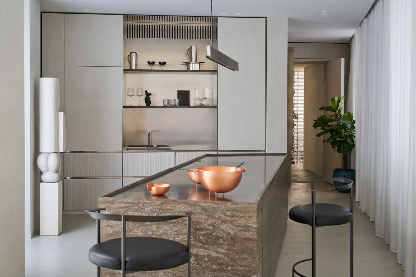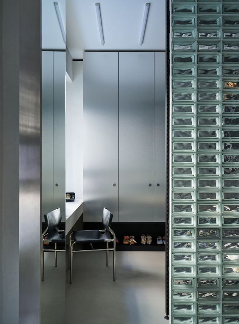 A three bedroom Brutalist apartment in the heart of Milan. The concept includes materials such as concrete, glass, iranian travertine marble, steel and resin. Light plays a fundamental role, the spotlights are softly recessed in the ceiling, almost disappearing and the large shower in the master has a ceiling entirely in barrisol creating this particularly emotional zenithal light effect.