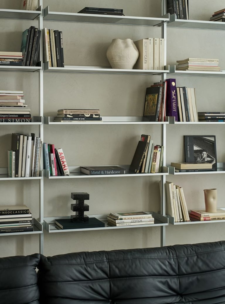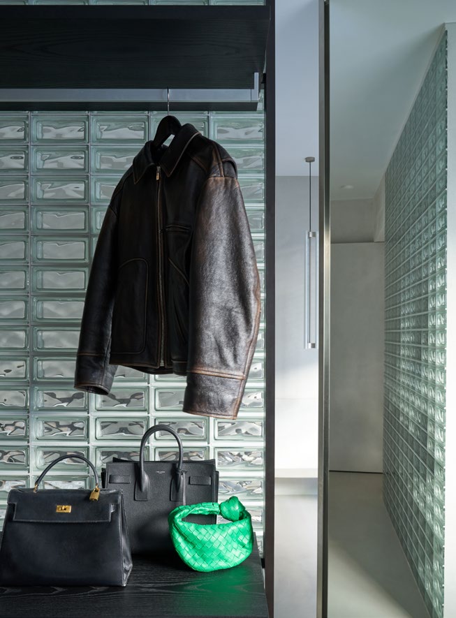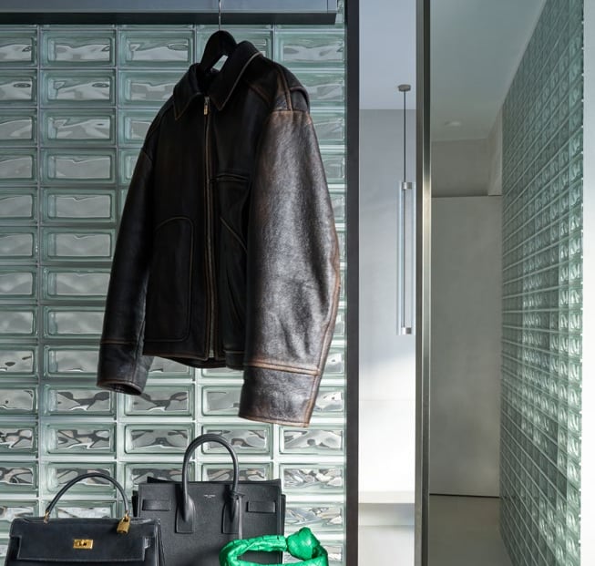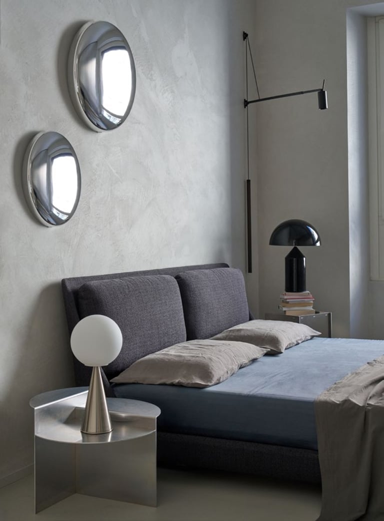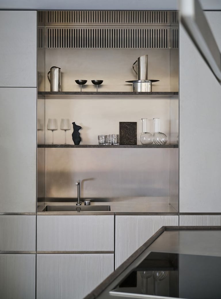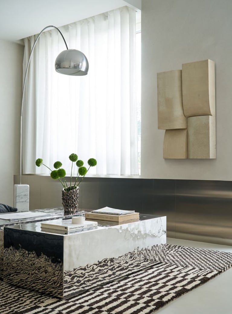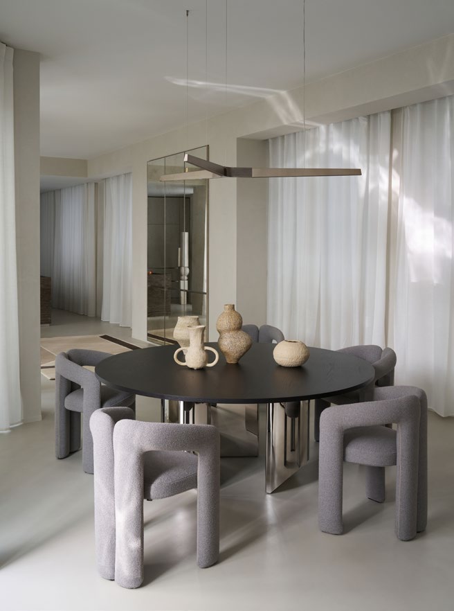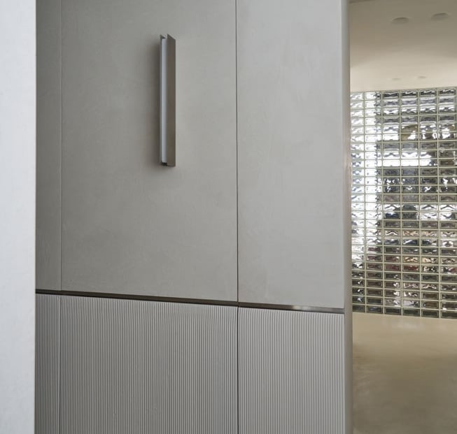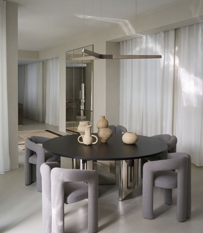 A three bedroom Brutalist apartment in the heart of Milan. The concept includes materials such as concrete, glass, iranian travertine marble, steel and resin. Light plays a fundamental role, the spotlights are softly recessed in the ceiling, almost disappearing and the large shower in the master has a ceiling entirely in barrisol creating this particularly emotional zenithal light effect.