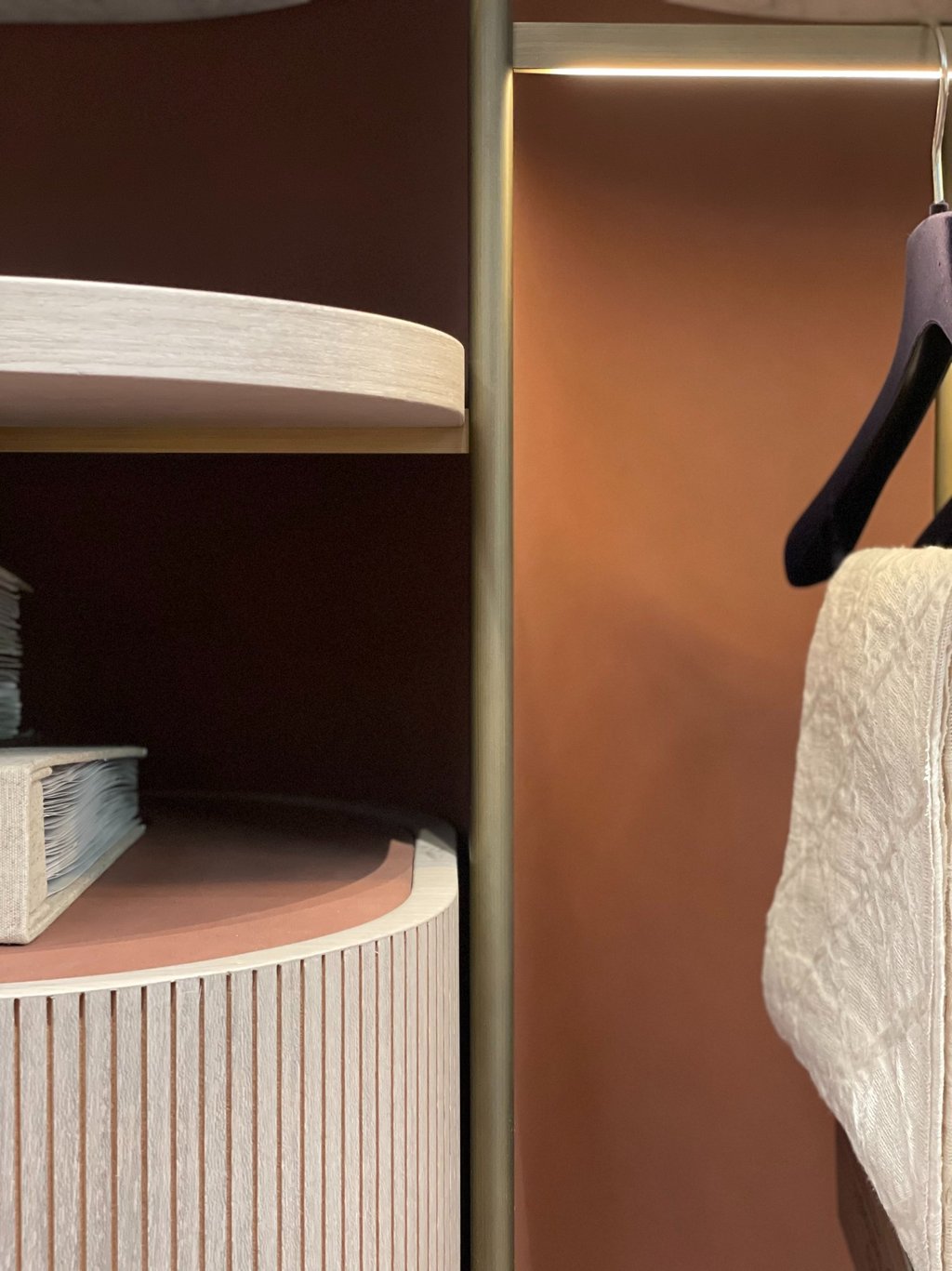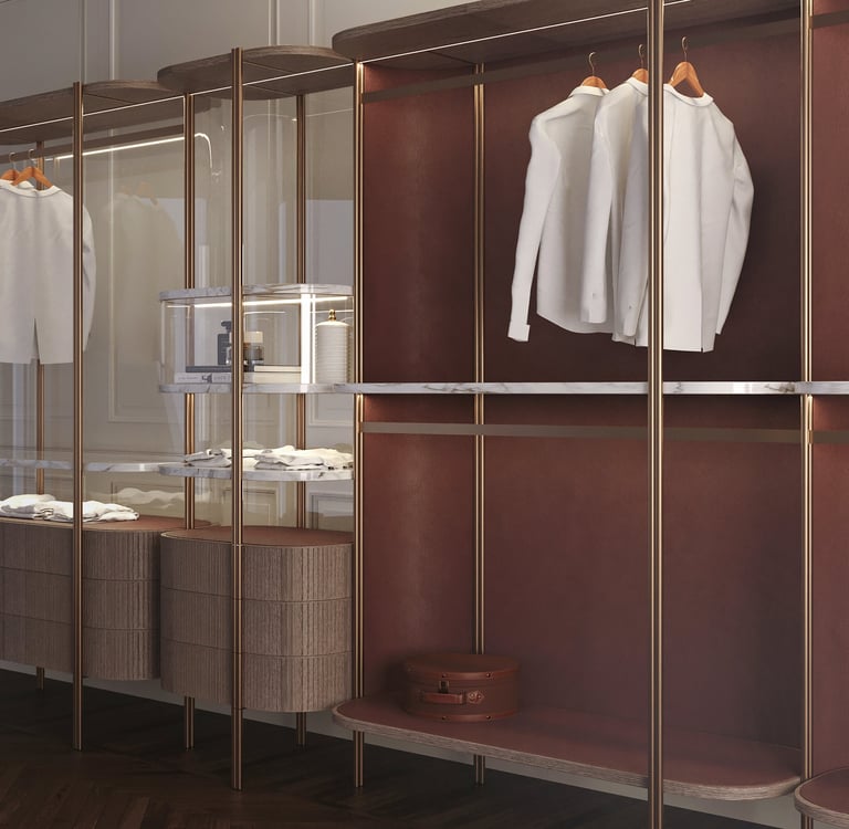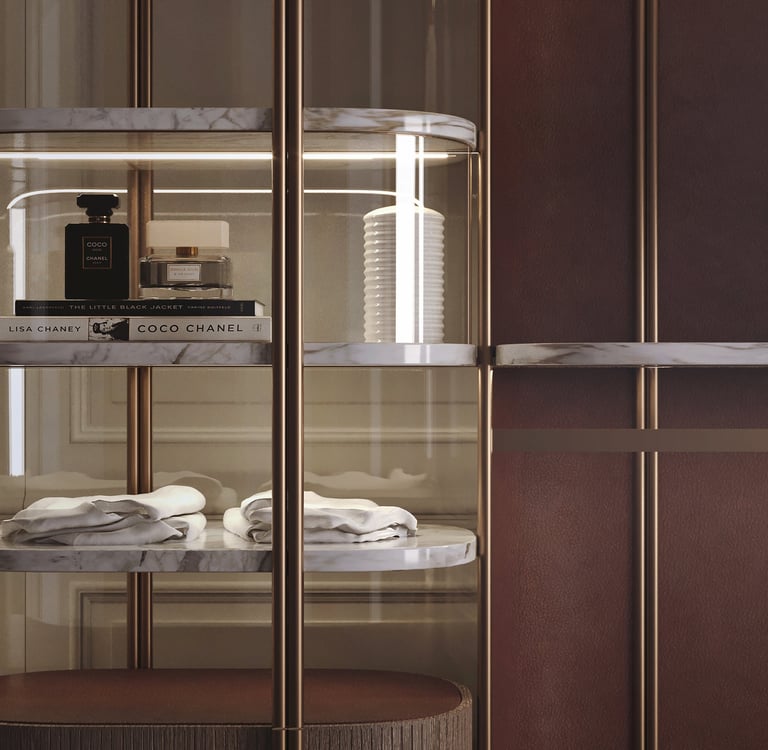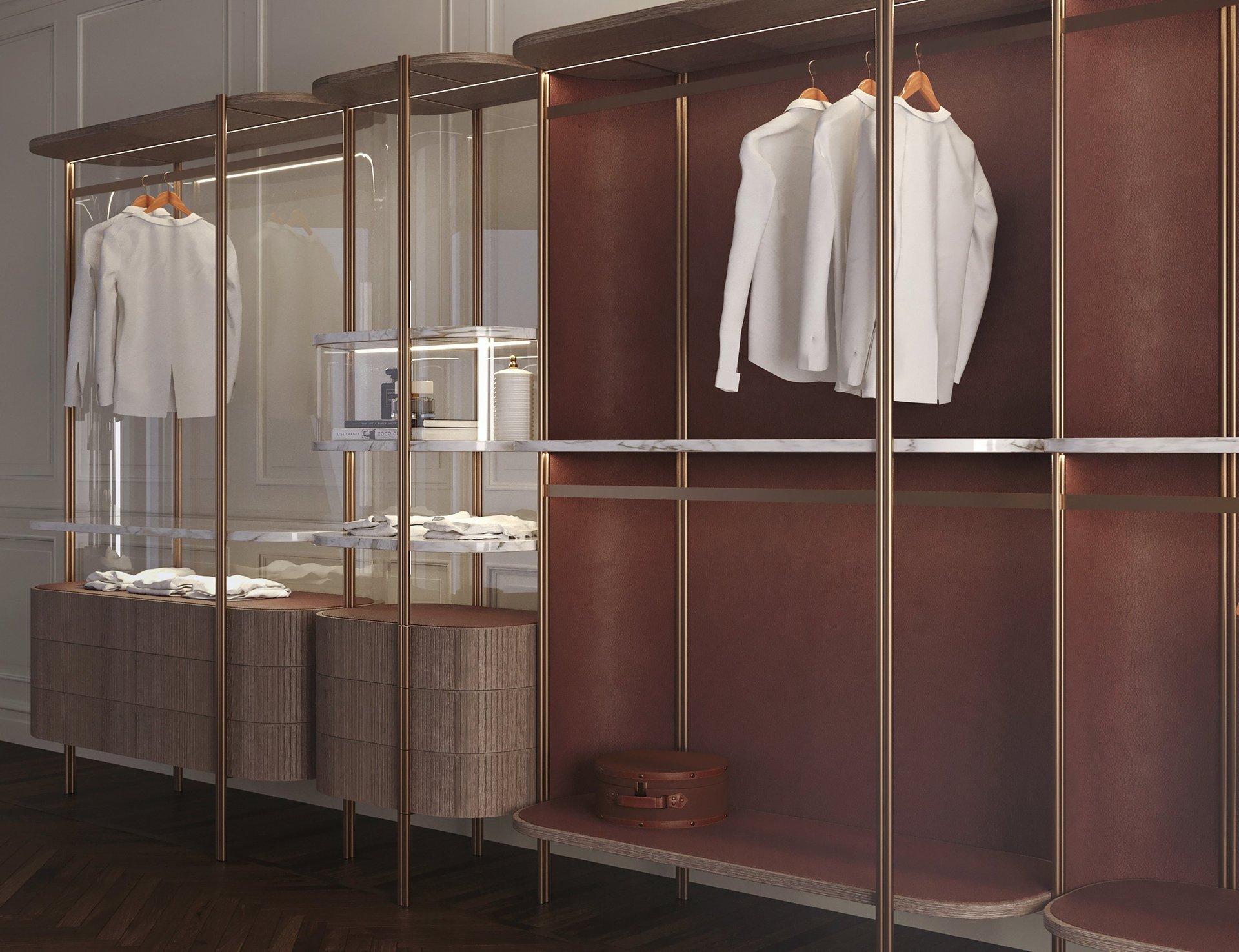 Closet, also in double-sided version, has fine materials guarantee a minimal and sophisticated look. The frame is made of brushed brass, marble trays, walnut ribbed wood drawers and back panel covered with leather.