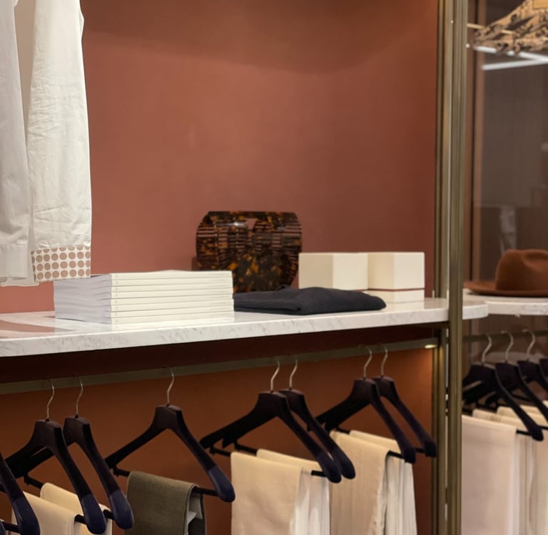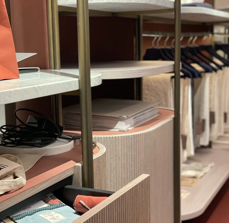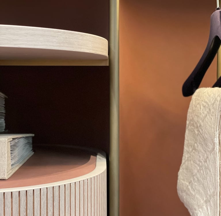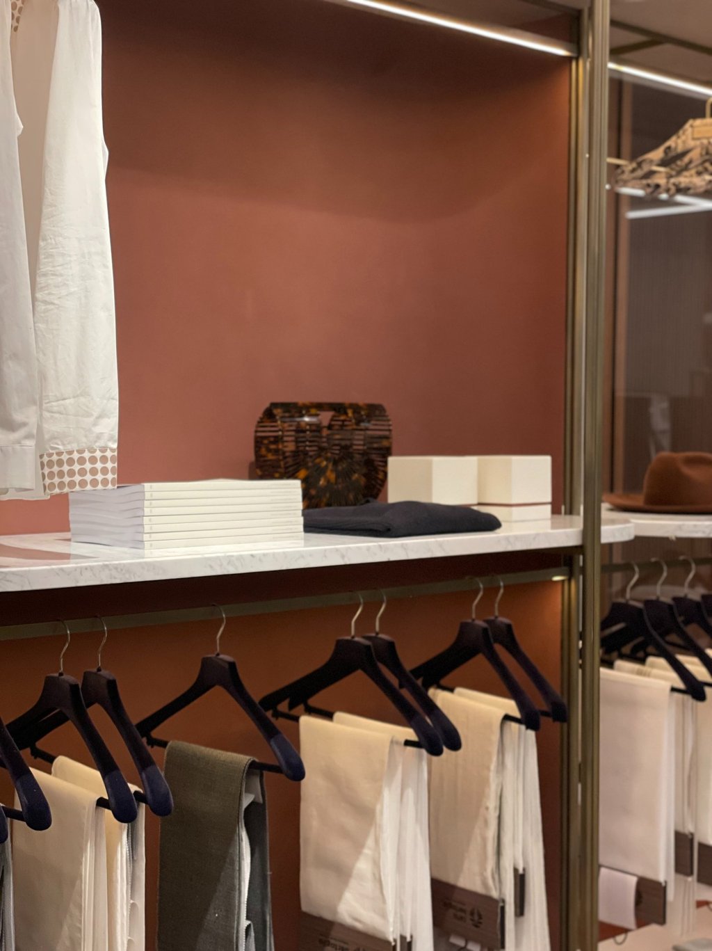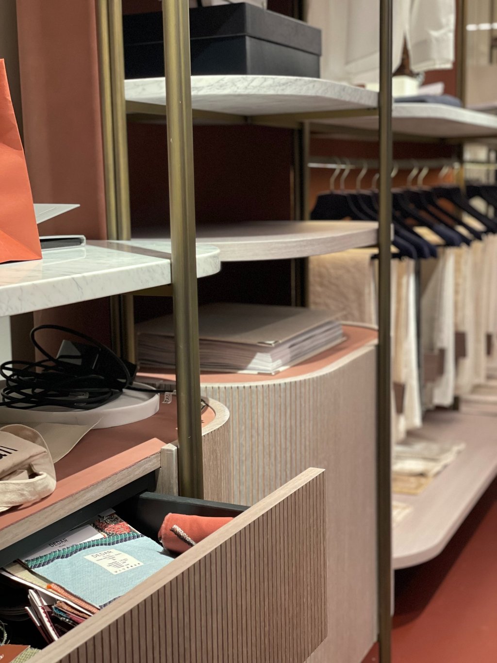 Closet, also in double-sided version, has fine materials guarantee a minimal and sophisticated look. The frame is made of brushed brass, marble trays, walnut ribbed wood drawers and back panel covered with leather.